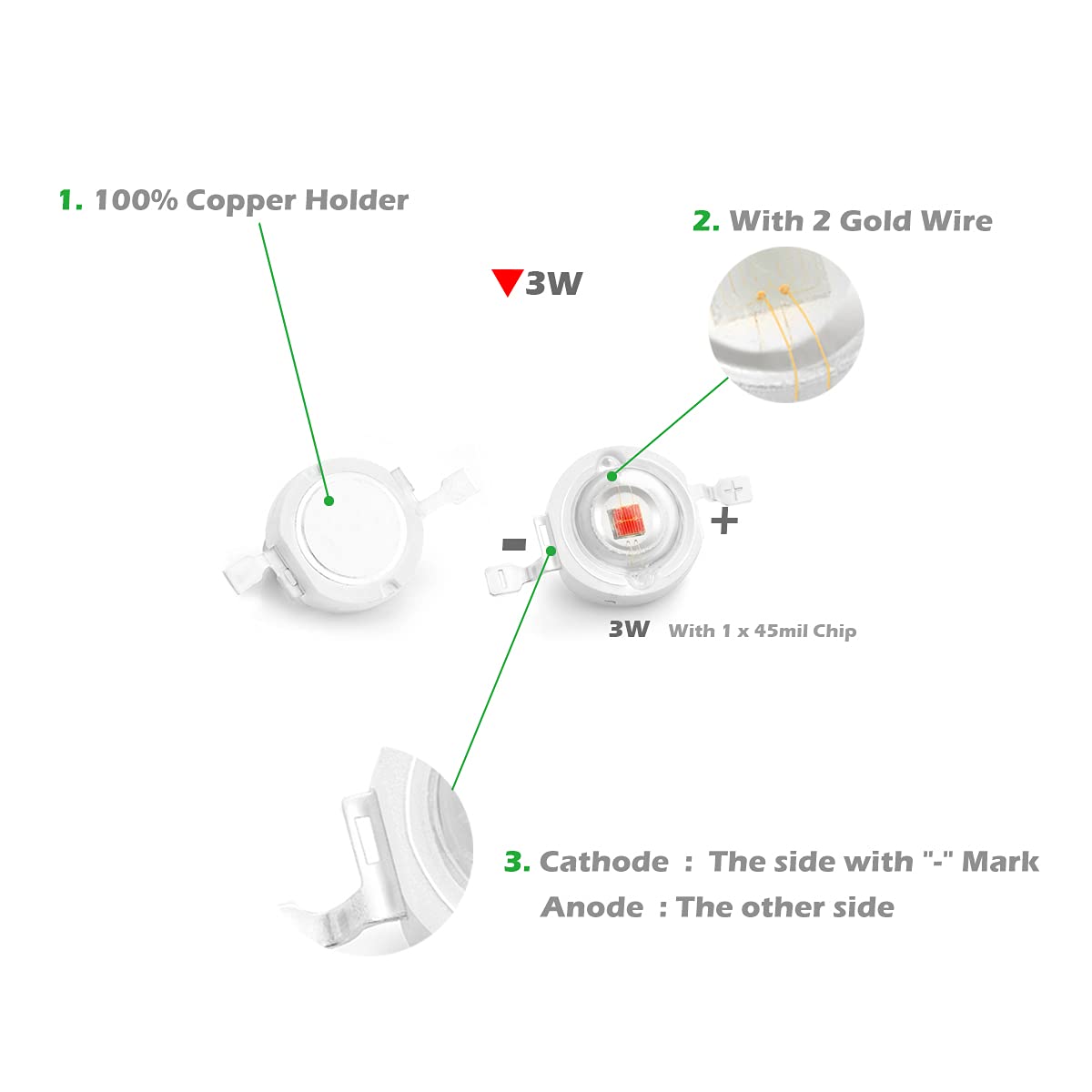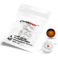 Specification:Quantity: 10 pieces / PackBrand: ChanzonPower: 3 Watt (Max)Emitting Color: YellowRecommended Current: 450mAForward Voltage: 2.0-2.4VLuminous Flux: 90-100LMEmitting Angle: 120-140 degreeWith Double Golden Wire (99.99%) and Copper FrameKindly Reminder:Constant current LED drivers are recommended for high power COB LEDs.Working temperature should be less than 60 Degrees Celsius / (140 Fahrenheit) with a Heat Sink System.Please refer to the positive (anode +) and negative (cathode -) sign on Leds.Related Accessories:Constant current LED drivers (450mA Plastic Case): ? Search B01N25KD4X on AmazonConstant current LED drivers (450mA Aluminum Case Waterproof): ? Search B01MYBGU2X on AmazonConstant current LED drivers (450mA No Case only PCB Board): ? Search B01MSANI4E on AmazonLED Heat Sink Star Aluminum Base Plate: ? Search B06XKPNRWL on Amazon