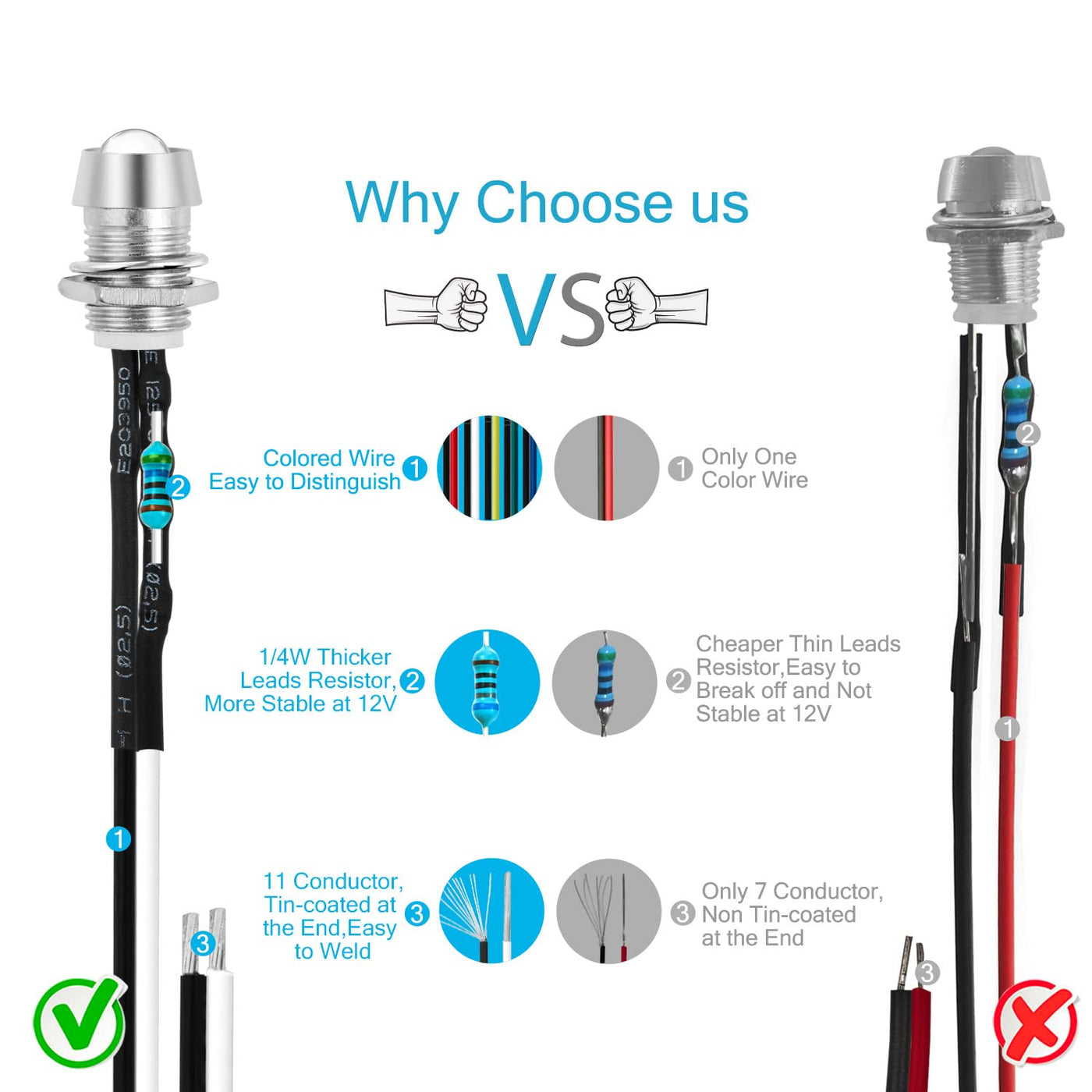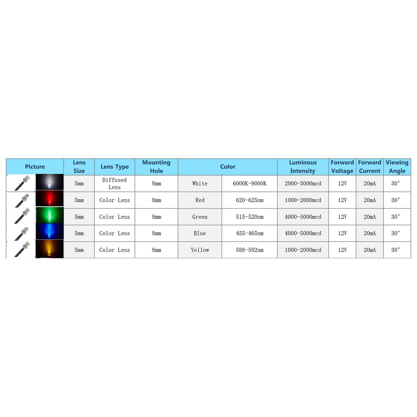10 Pcs 12v 8mm LED Panel Pilot Dash Warning Light Indicator Lamp Car Van Boat Indicator Light Lamp Pilot Dash Bulbs Directional.Universal for Cars, Van, Trucks, Boats. Anti-shock,corrosion and vibration resistant, Safe, durable, economical and practical. Specifications:Material: Chrome Plating Surface + Metal ShellLight Color: Green, Red, Blue, Yellow, WhiteVoltage: 12V DC(colored is positive and black is negative)Lead Length: 7.9'' / 20cmPanel opening diameter: 8mmLED diameter: 5mmFitment: For Universal Cars, Van, Trucks, BoatsNote:1. Please allow 0~1 inch error due to manual measurement. Thanks for your understanding.2. Monitors are not calibrated same, item color displayed in photos may be showing slightly different from the real object. Please take the real one as standard.
