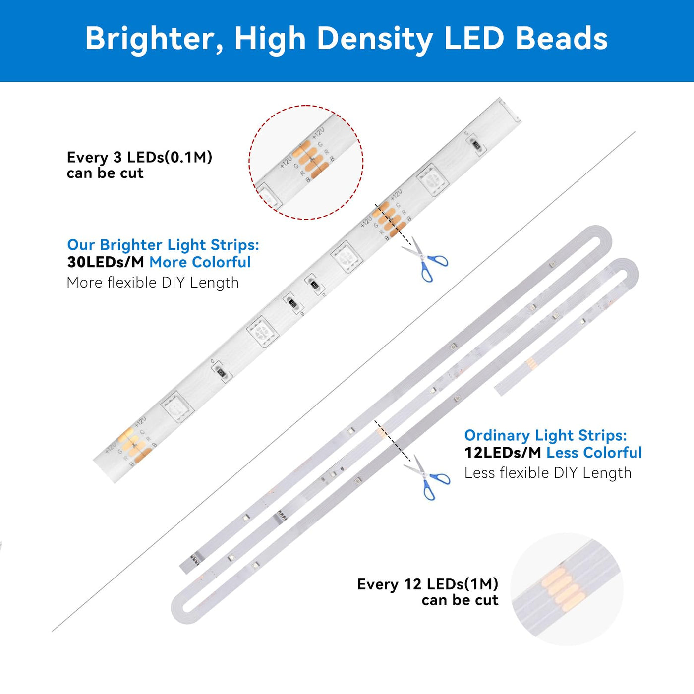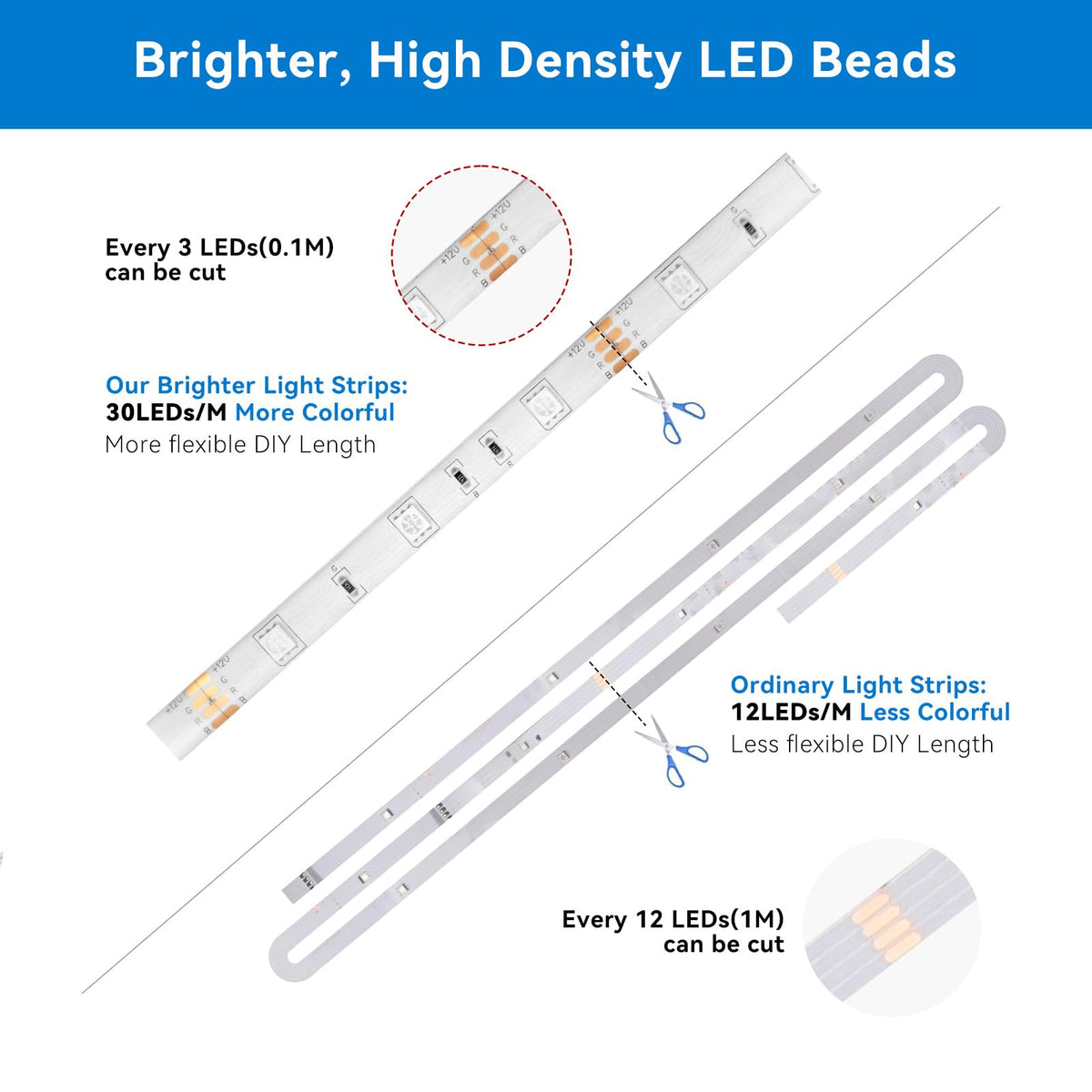 Q: What is the density of the LEDs in these strip lights?A: These LED strip lights feature a high density of thirty LEDs per meter, resulting in brighter and more evenly distributed lighting compared to lower density strips.