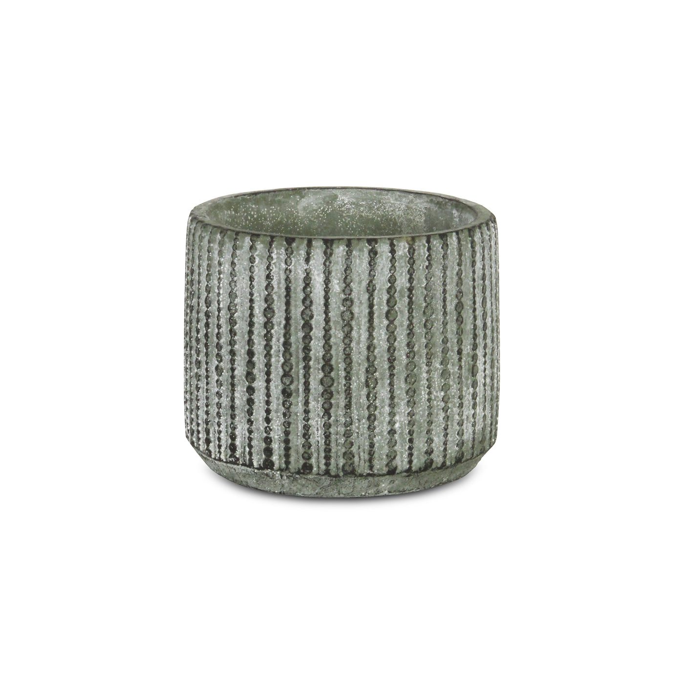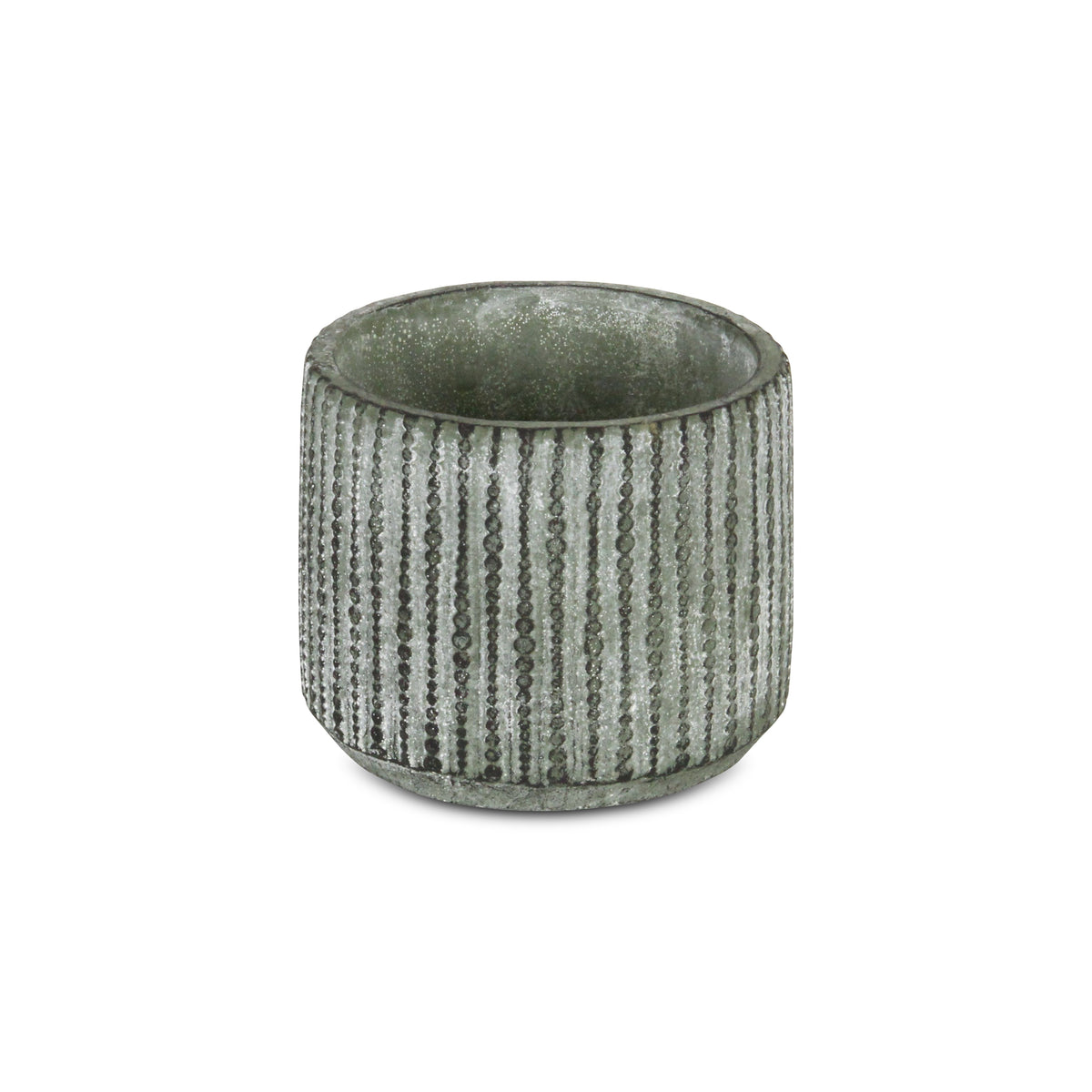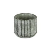 Q: What design features set this cement pot apart from others?A: This cement pot features a distinctive vertical dotted pattern with a repeating orb accent-band, finished in complementing hues of gray, making it a stylish addition to any decor.