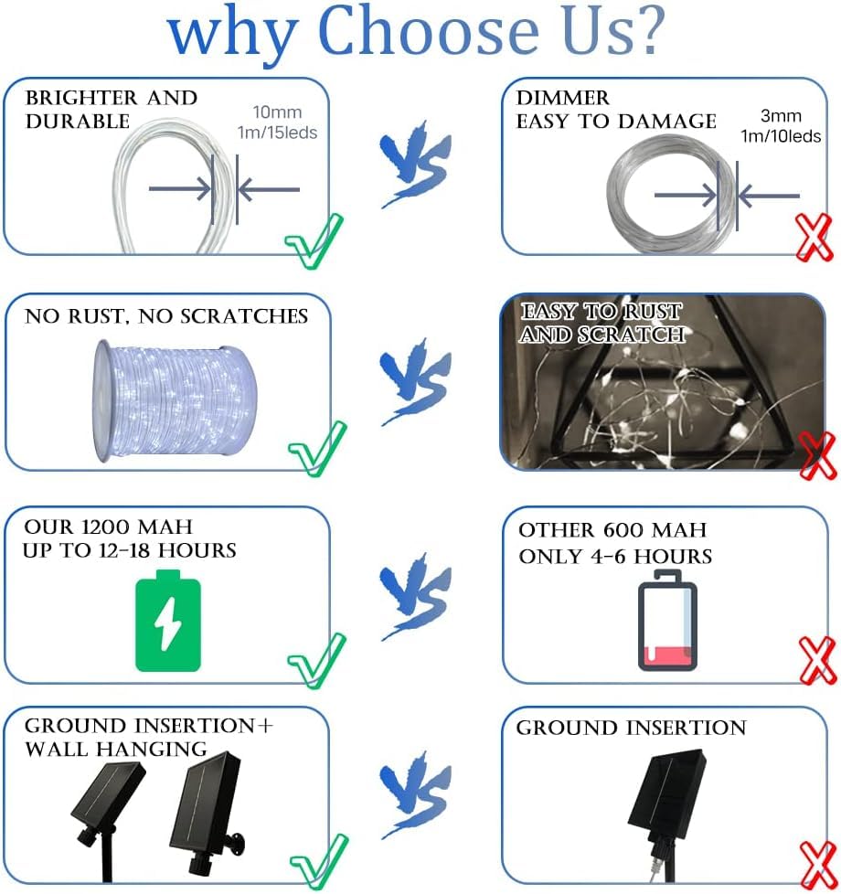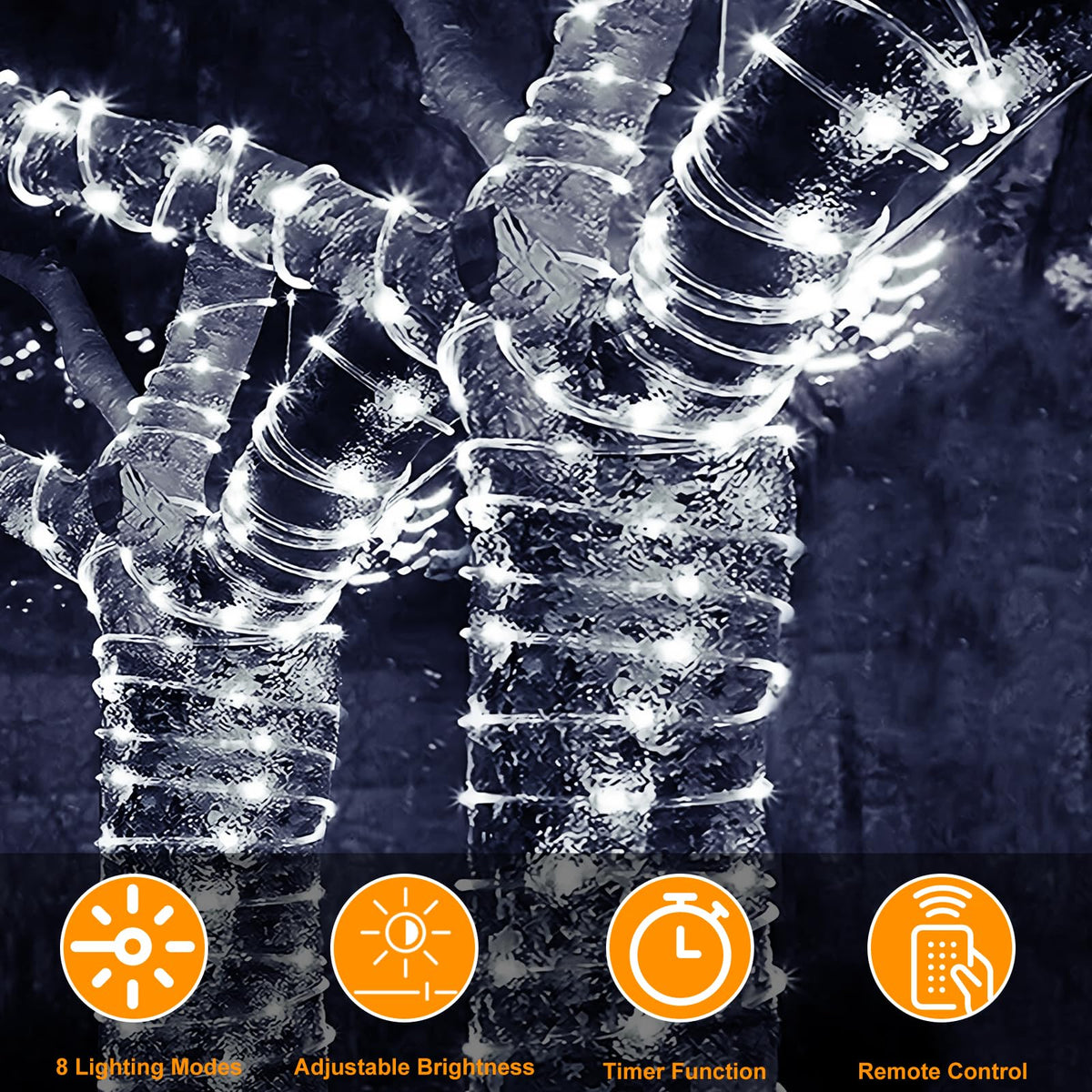- **Waterproof Design**: Featuring a robust construction with clear PVC tubes, these solar rope lights boast an IP65 waterproof rating, ensuring reliable performance in any weather condition.