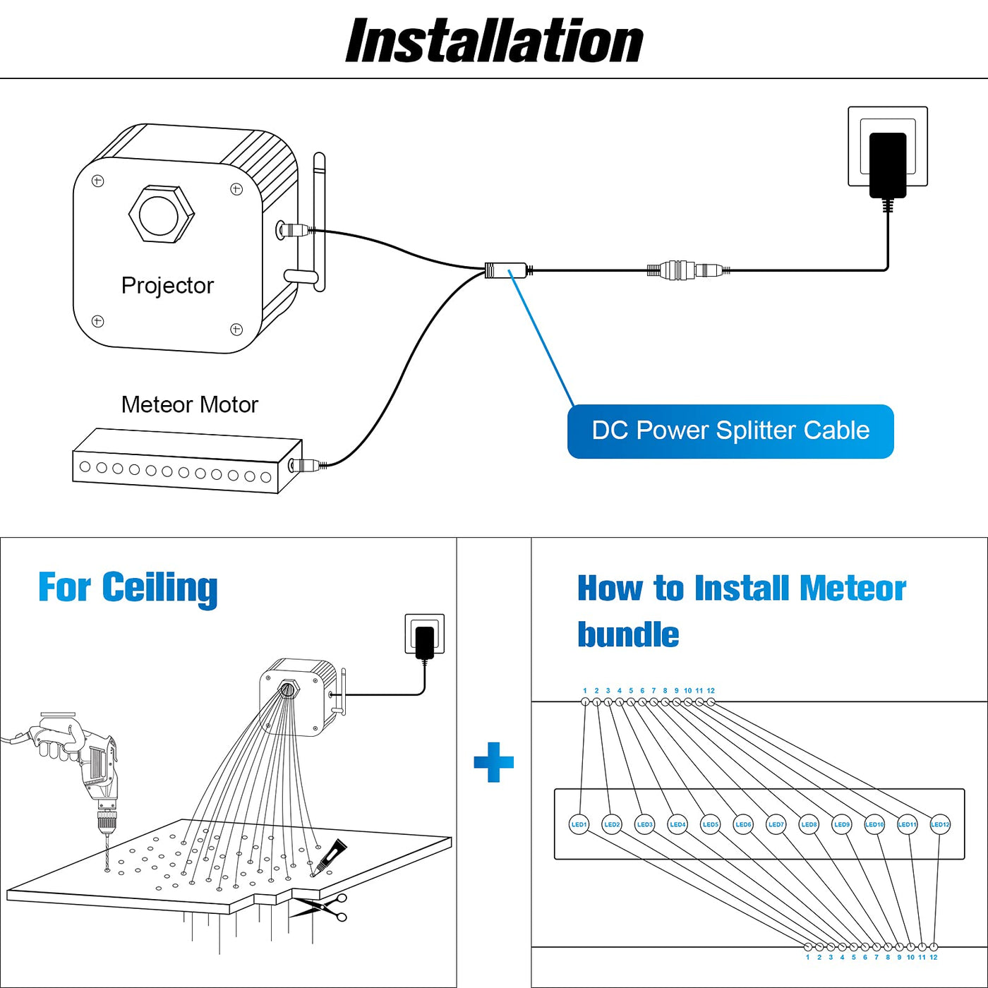 This projector features a combination of 550 pieces of 0.03-inch fiber optics with a length of 13.1 feet, along with an additional 96 pieces of meteor cable. Crafted from well-made PMMA plastic, the fiber optic cables are non-conductive, waterproof, and flexible, ensuring safety and durability. The projector emits a vibrant RGBW light, providing a wide color spectrum and adjustable brightness. The built-in sound-activated mode allows the starlight to dance in sync with music, enhancing the ambiance of any gathering.