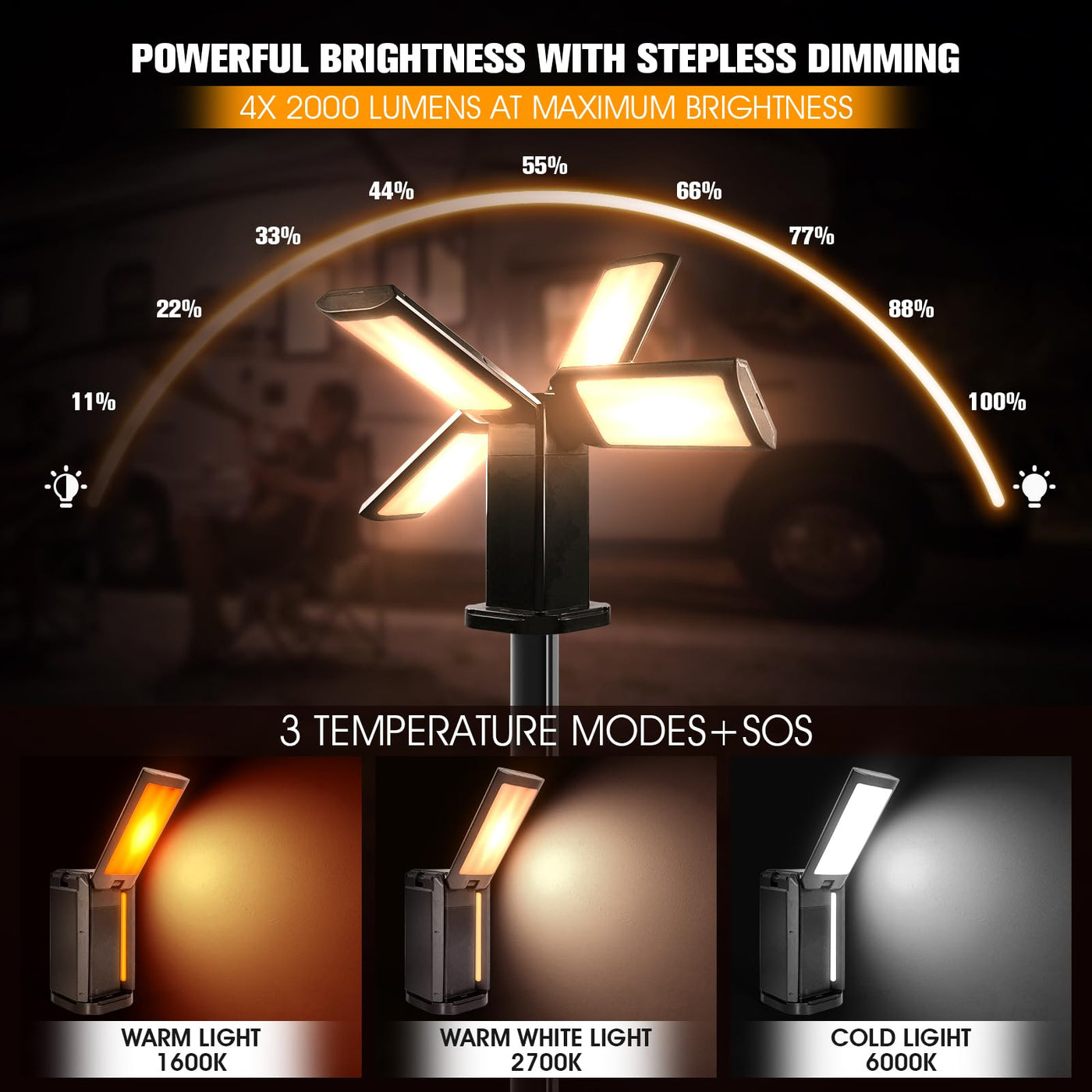 This 14000Mah Rechargeable Led Work Light Combines Powerful Performance And Convenience, Featuring Four Rotating Led Blades That Provide Adjustable 180 Vertical And 270 Horizontal Coverage For Enhanced Lighting In Any Direction. With A 6000-Lumen Max Brightness And Three Color Temperature Modes (Warm, Warm White, And White), This Light Ensures Flexibility In Various Settings. The Stepless Dimming Function Allows You To Customize Brightness, While The 14000Mah Battery Delivers Up To 4 Hours Of Continuous Use At Full Brightness. Rechargeable Via Usb And Paired With A Detachable 70-Inch Tripod, Its A Portable And Versatile Solution For Both Work And Outdoor Activities.