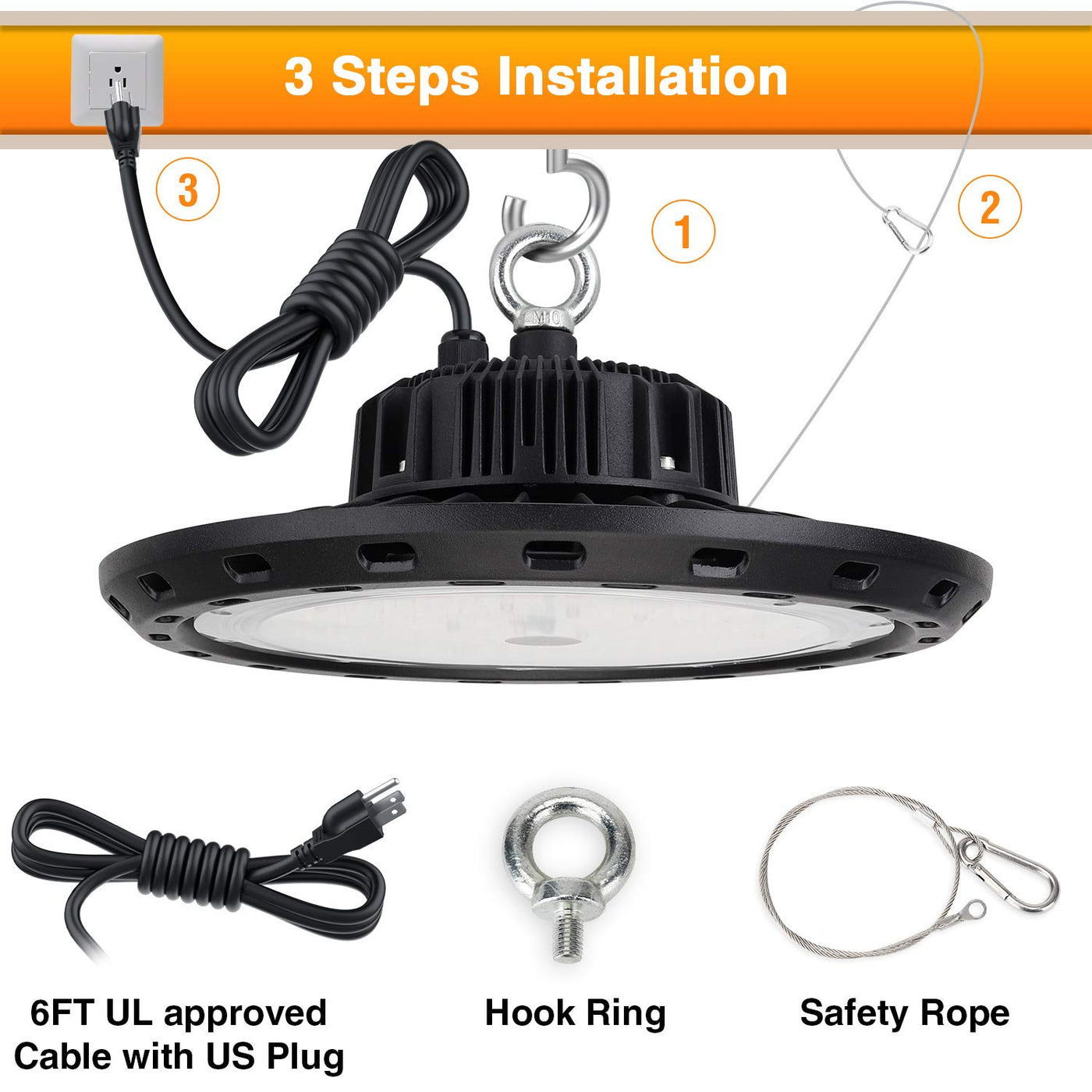 - **Easy Installation**: Designed for hassle-free setup, the UFO LED high bay light comes with clear installation instructions, a strong ring, safety rope, and a UL-certified 6ft power cord with US plug, allowing for quick and efficient installation.