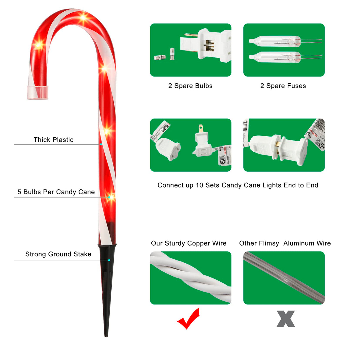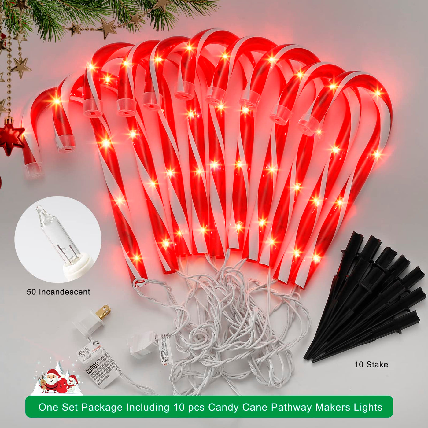 ??10 Inch Candy Cane Lights Christmas Decorations Outdoor With Plug-In 120V Ul ?? ?? If You Are Going To Decorate Your Christmas-Themed Outdoor D Cor Decorate The Front Yard Of Your House. These Exquisite Christmas Candy Cane Sidewalk Lights Are Great For Your Candy Christmas Decor. This Christmas Candy Cane Light Up Your Pathway Decoration Will Meet Your Requirements. ?? Red&White Candy Cane Lights On Pathways Are Made Of Premium Quality Thick Plastic Material Against Bad Weather And Stand Well. Ip44 Waterproof Level.Safety Using For Outdoor Even The Weather Is Snow Or Rain. ?? The Whole Christmas Candy Cane Path Lights Are Made Of Sturdy Copper Wire Cable With Ul-Certified, Is More Safety For Use And Touch(But There Are Other Competing Products Are Made Of Flimsy Aluminum Wire As The Conductor, You Will Choose High Quality And Durable Candy Canes Outdoor Lights. Right?). ?? The Whole Set Of 10 Candy Cane Lights Has 50 High-Quality Traditional Incandescent Bulbs, It'S Soft Glowing More In Line With The Traditional Celebration Of Christmas, These Christmas Light Up Candy Cane Outdoor Will Decorate Your Outdoors And Illuminates The Pathway Of Your Home, Creating A Nostalgic Decorative Charm, And Delight Your Family'S And Guests To Your Amazing Christmas Party. ?? How Many Sets Of Candy Canes Pathway Light Can Be Connected? You Can Order 2 Sets Of 10 Pack Candy Canes Christmas Pathway Lights And Make Christmas Candy Cane Driveway Markers On Both Sides To Have A Long Perfect Display. ?? The Yard Markers Candy Lights Are Easy To Connect To The Power Source Of 120V. It Can Work 24/7 To Keep Your Festival In A Lively Atmosphere. (Please Note That The 120 Voltage Plug Should Not Be Exposed To Rain). The Male And Female Plug Allows 10 Sets Of Candy Cane Yard Decorations And Christmas Lights To Be Chained Together. There Are Extension Plugs On Both Ends. One Set Of Red Lighted Cand