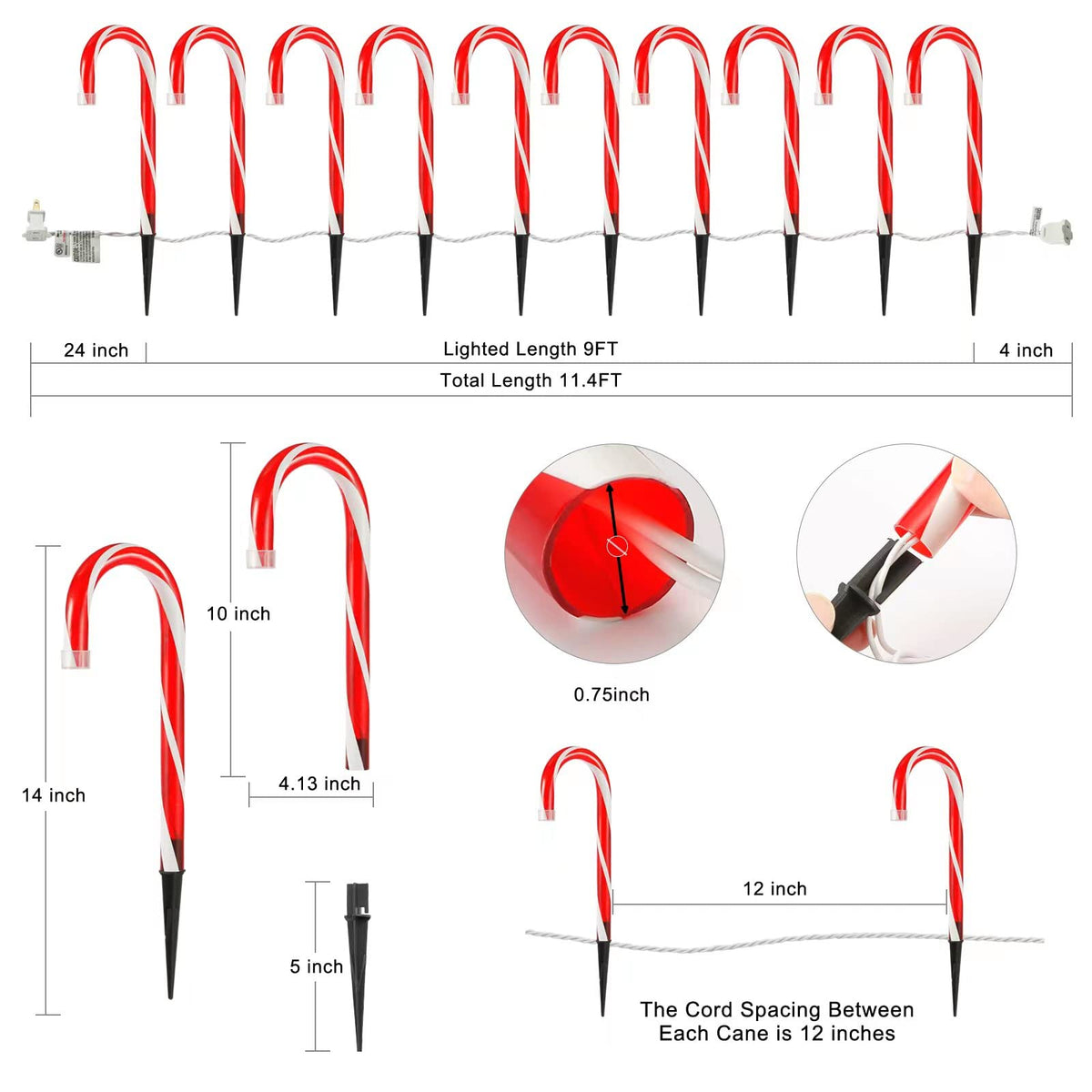 Q: What are the dimensions of the Christmas Candy Cane Lights?A: Each candy cane light stands 10 inches tall, and the entire strand with 10 candy canes measures approximately 11.4 feet in length, including a 24-inch lead wire.