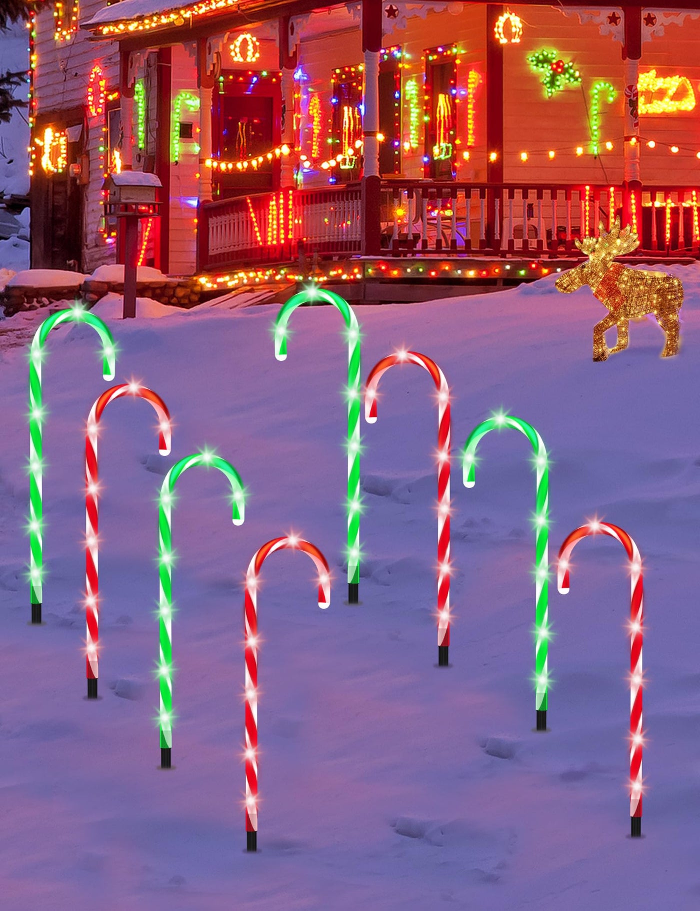Q: How many Candy Cane Pathway Markers are included in the set?A: The set includes a total of 8 Candy Cane Pathway Markers, which consists of 4 red and 4 green candy canes, allowing you to create a festive and colorful pathway to welcome guests during the holiday season.