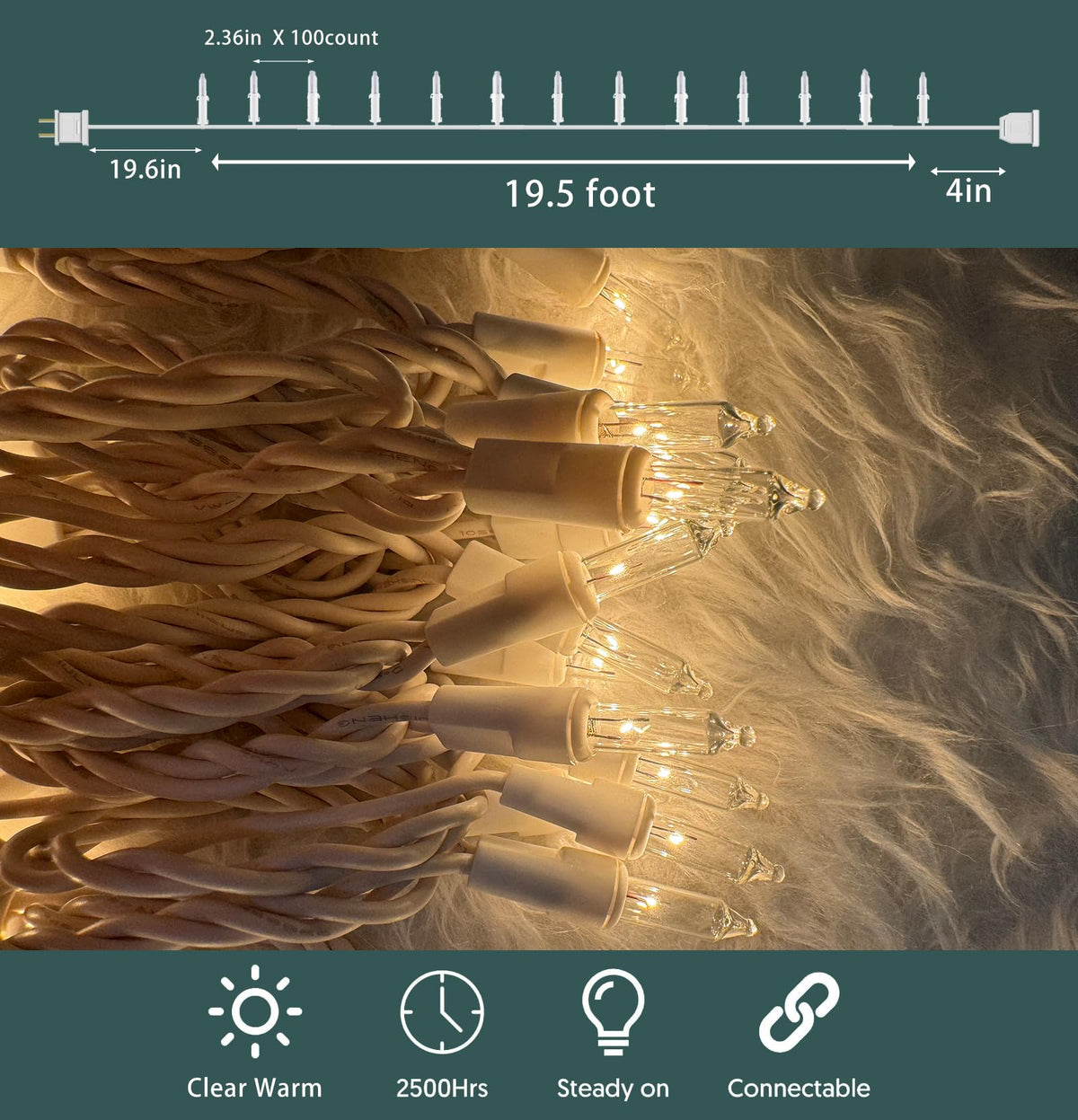 Perfect Christmas Decoration Perfect For Indoor And Outdoor Decorations. Christmas Halloween Party Valentine S Day Wedding Home Window Bathroom Festival Holiday Shows Restaurant Hotel Commercial Building Shopping Center Trees Wreaths Wrapping Trees Patios Pergolas Bushes Hedges Fences Pillars Etc. Light Set Specifications 19.6 Male Lead 4 Tale 2.36 Between Bulbs Total Length: 21 Foot Lighted Length:19.5 Foot 2 Lighting Modes Comes With 2 Clear Replacement Bulbs 1 Fuse And 2 Flasher Bulbs Wattage Specifications Each 100 Light Set Is Rated 42.5 Watts Connect End To End Connect Up To 5 Of These Same Sets End To End. Package Included: 1 X 100Count Mini Clear Lights String 1 X User Manual 1 X Fuse 2 X Clear Replacement Bulbs 2 X Flasher Bulbs