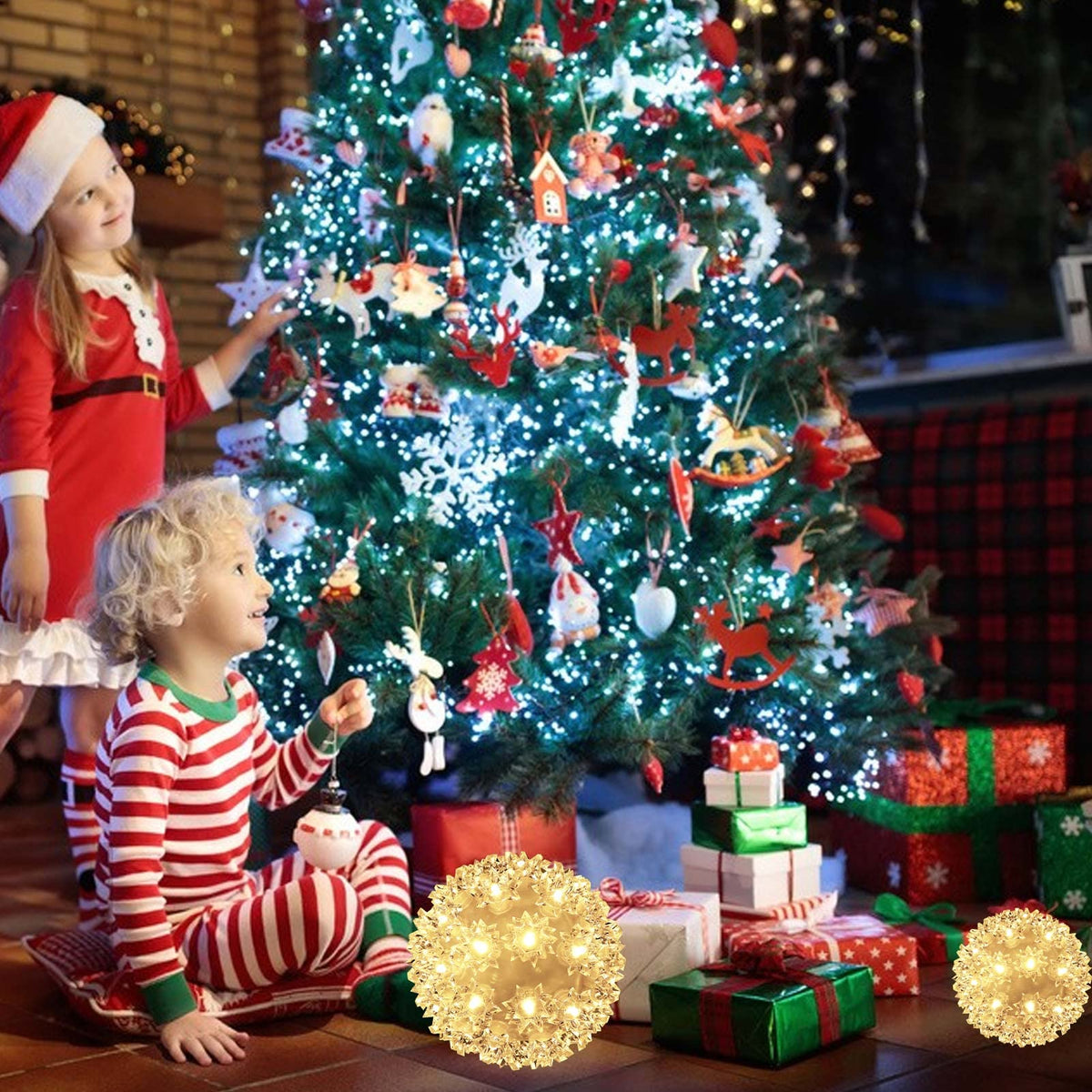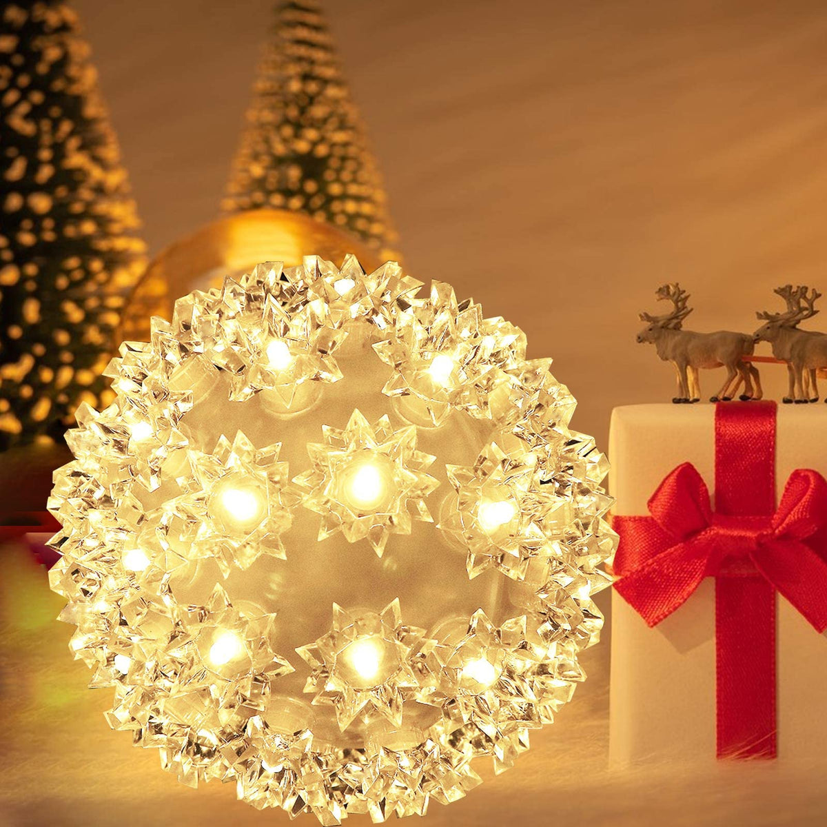 Q: Are these lights suitable for outdoor use?A: Yes, the Christmas Lights Ball is designed for both indoor and outdoor use, featuring an IP44 ingress protection rating, which means it is resistant to water splashes.