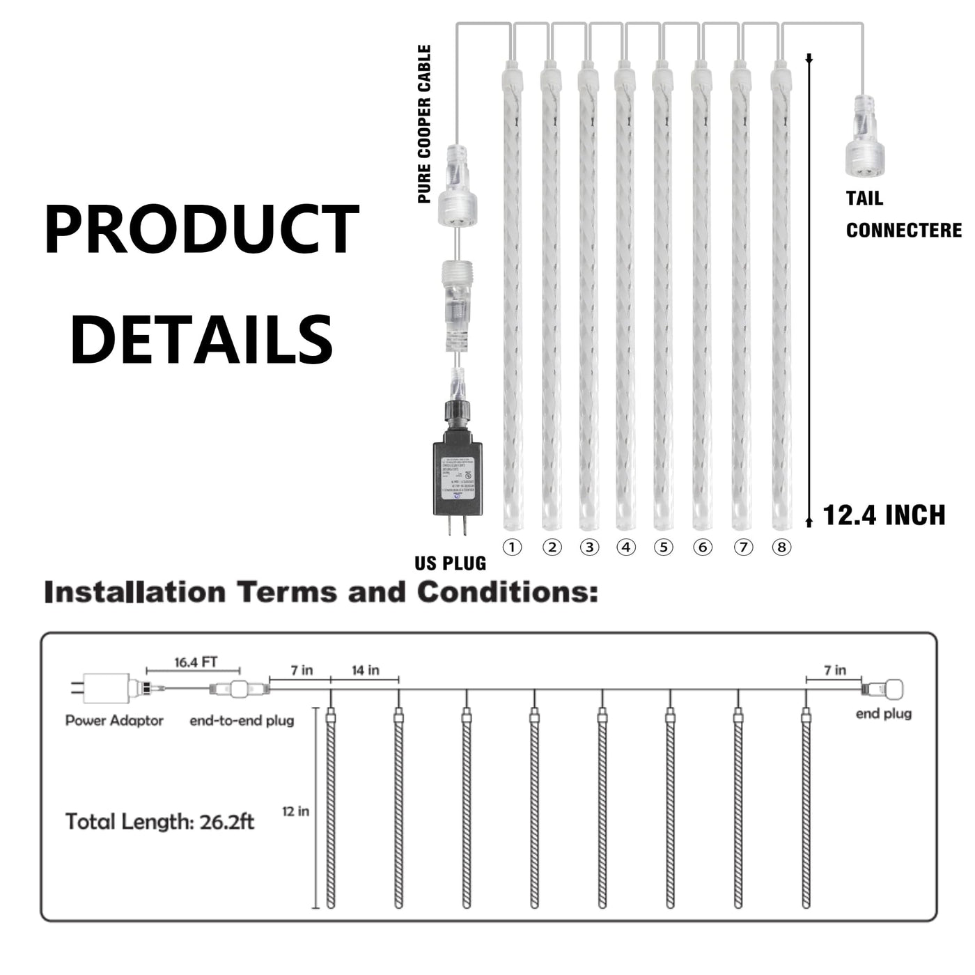 Q: What are the dimensions of the TW SHINE Christmas Lights?A: The TW SHINE Christmas Lights consist of 8 tubes, each measuring 30 cm (12 inches) in length, with a wire spacing of 40 cm (15.7 inches) between each tube. The leading cord measures 2.1 m (6.9 ft).