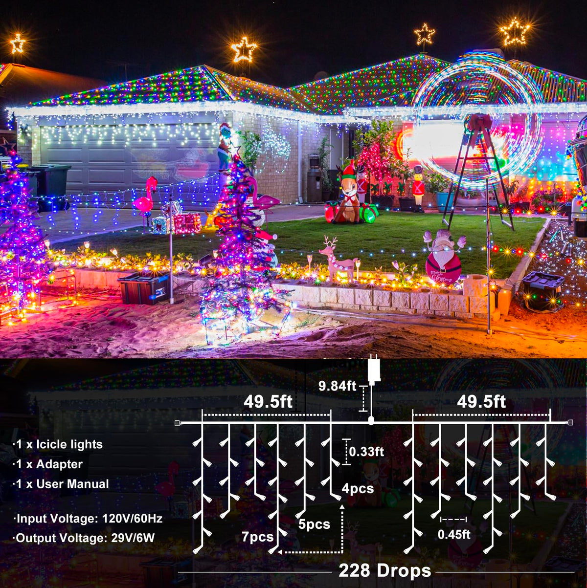 Q: What is the length of the string and the drop lengths of the icicle lights?A: The string length is 99 feet, featuring 228 vertical strands of icicle lights that hang at three different lengths, adding elegance to your outdoor decorations.