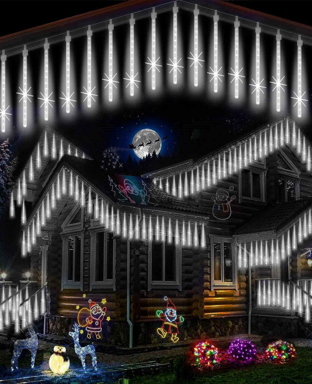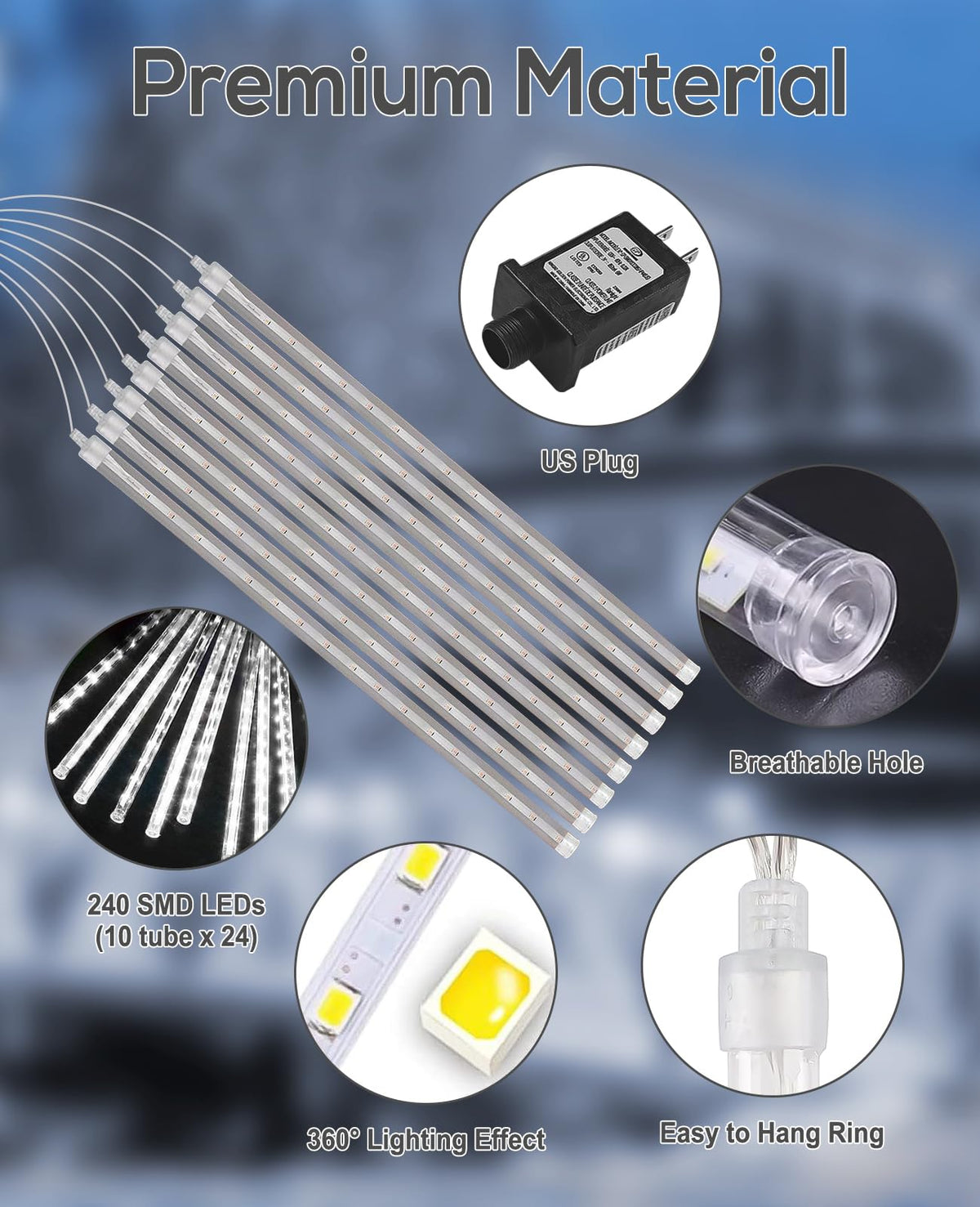 Eagwell Meteor Lights Christmas Decorations Are Perfect To Create A Special Romantic Atmosphere Like Real Meteor Shower ! Led Meteor Shower Tube Lights Are More Convenient To Create Romantic Atmosphere And Perfect For Hanging In Anywhere You Want! The Icicle Tree Light Of Every Bulb Turns On And Out One By One In Sequence And Quickly Just Like Meteor Shower Or Falling Snow In The Night Sky, Very Beautiful. Just Hang The Snowfall Led Lights In The Places Where You Like. Ideal For Christmas, New Year, Wedding, Party, Any Festival Or Holiday. Hang Them On Xmas Trees, Roof, Home, Window, Bedroom. Connectable Meteor Shower Lights,Extending As Long As You Need To Fit The Scene, It Could Be Extended Up To A Maximum Of 10 Light Chains (Maximum 226 Ft Long) If You Are A Business Buyer, Multiple Raindrop Snow Falling Lights Is Good To Use To Decorate Trees Along Streets, Parks, Rivers, Urban Night Lighting, Attractions Landscaping, Gardening, Community Night Crystal Decoration, Hotels, Shopping Malls, Night Entertainment. Eagwell Xmas Lights Outdoor Take You Into A Dream Kingdom Specifications:Plug Types: Ul Listed Plug Led Bulbs Of Per Tube: 24 Tube Quantity: 10 Tubes Illumination Angle: 360? Number Of Led Bulbs: 10 Tubes X 24 Led (240 Led Lights) Tube Length: 12 Inch, Tube Dia.: 1Cm Length Between Us Plug And The First Tube: 9.8 Ft/3M Length Between Tubes: 15 Inch/40Cm Total Length: 22.6 Ft/6.9M Driver: Input Ac110V-240V / Output 7V Dc Watt: 6W Lifespan: 30000 Hrs What You Will Get?1X Meteor Shower Lights 1X Ul Listed Plug