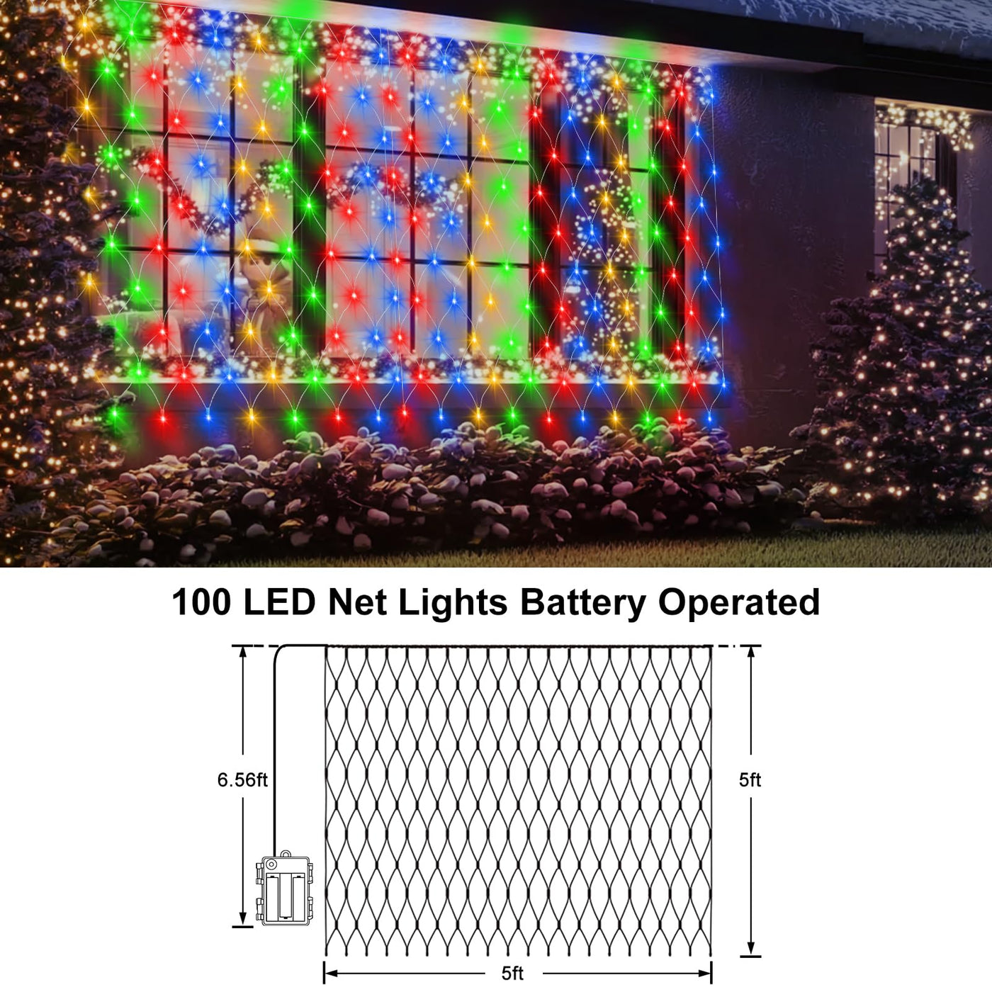 Echosari Battery Operated Net Lights Outdoor Mesh Lights, 100 Led Color Changing Net Christmas Lights 5Ft X 5Ft Green Wire Net Lights With Remote 12 Modes Bush Lights For Garden, Shrubs, Backdrop, Fence Decor Specifications: Brand: Echosari Wire Material: Pure Copper Cable Color: Green Light Color: Warm White & Multicolor Main Cable Length: 100Ft Battery Pack To First Light: 1 Ft. Distance Between Led: 10Cm Number Of Led Balls: 100 Bulb Life:Up To 50,000 Hours Working Voltage:3V 3 X Aa Batteries Required (Not Supplied) Ce/Rohs/Fcc Approved&Nbsp; Features: 12 Models Light Sequences (1.Combination 2.Color1 Stead On 3.Color2 Steady On 4.Twinkle 5.Mixed Colors1 Stead On 6.Mixed Colors2 Stead On 7.Slo-Glo 8.Breathing 9.Color1 Twinkle 10.Color2 Twinkle 11.Flash 12.In Wave). Automatic Cycling Timer (6 Hours On, 18 Hours Off Over Each 24 Hour Period). Built-In Memory Chip Recalls The Last Function Set. Dimmable, Press Dim- Or Press Dim+ Of Remote Control To Adjust The Brightness Of The Lights Ip54 Waterproof Rating, Can Be Used For Outdoor. Perfect For Use At Christmas, Easter, Other Celebration Events Or Simply To Give Your Home A Novel Warm Inviting Glow. Package Content: 1 X 100 Led Net Lights 1 X Remote Control