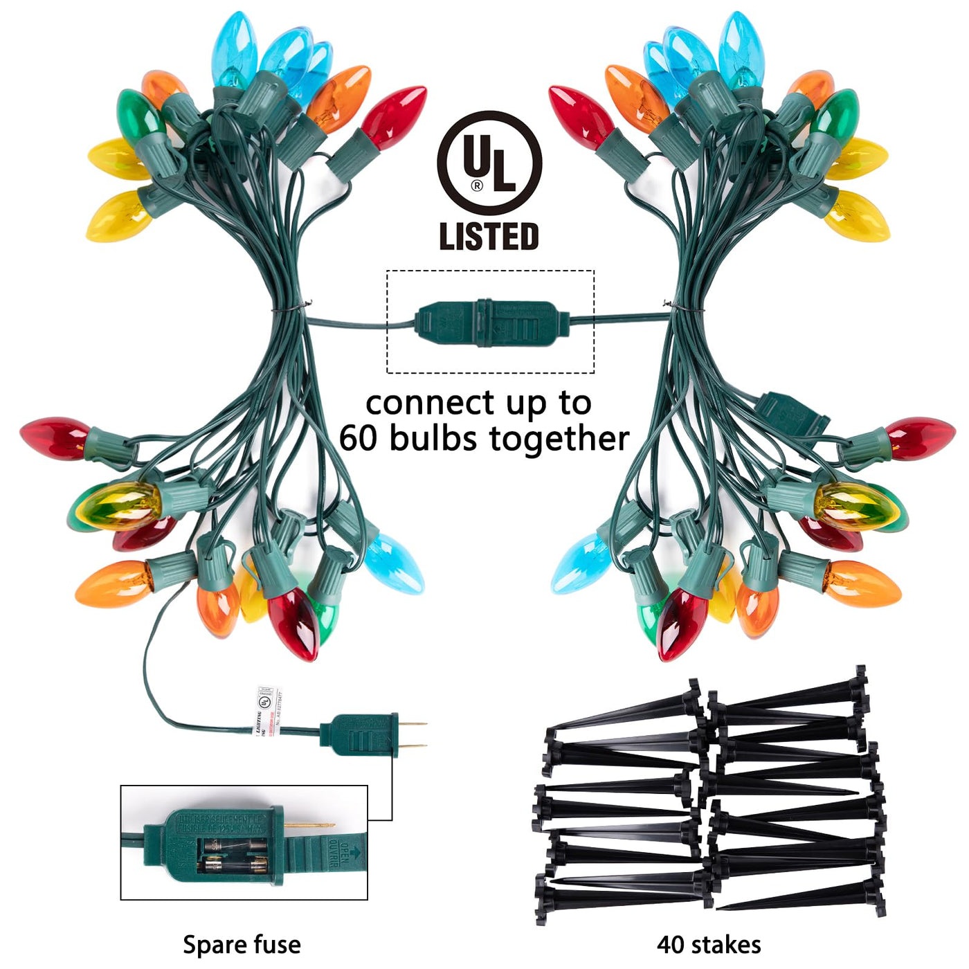 Christmas Yard Decorations Outdoor Is Perfect For Creating Charming Atmosphere In Christmas. Christmas Lights For Pathway With Green Wire, Perfect For Backyards, Gardens, Driveway, Walkway And Courtyard. Commercial Quality Christmas Outdoor Lights For Indoor And Outdoor Use Ul Listed For Outdoor Withstand Harsh Weather. Specifications Bulb Type: C9 Lighting Color: Multicolor (Red Green Blue Yellow Orange) Shade Material: Glassbulb Count: Each Set Has 20 Bulbs, Total 40 Bulbs Bulb Spacing: 15 Inches Lead Cord: 18 Inches End Cord Length: 6 Inches Max Connectable Strands: 3 Strands 25.7Ft String Lights Diameter Of Bulb: 1.14 Inch Cord Type: Green 20Awg Xtw Waterproof Grade: Ip44 Bulb Information:7W, 110V, C9/E17 Base Total Length: Each Set Is 25.7 Feet, Total 51.4 Feet Package List 2 Set Of 20 Bulbs Multicolor Christmas Yard Lights User Manual 40 Stakes