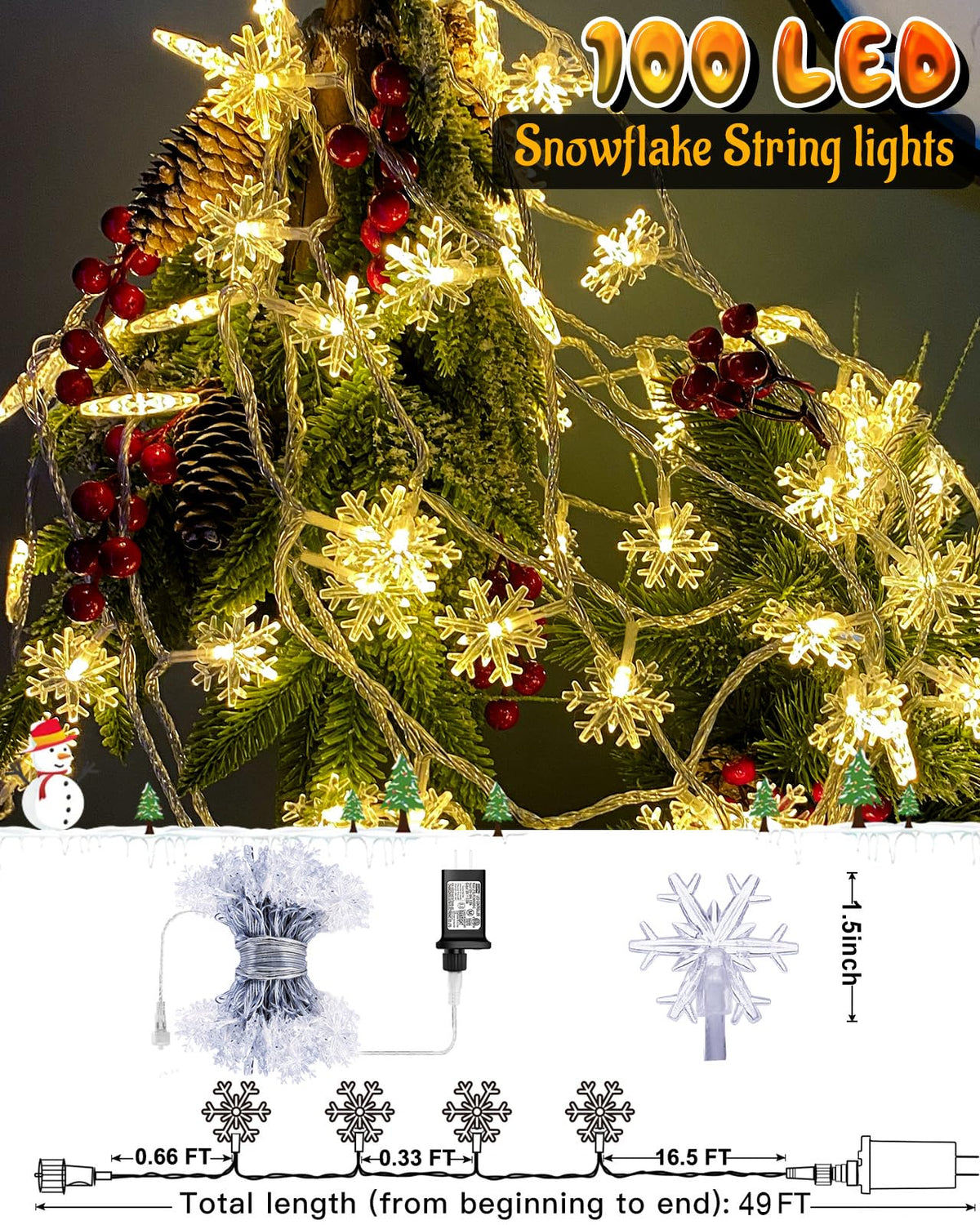 Q: What are the dimensions and specifications of the Christmas Snowflake String Lights?A: The Christmas Snowflake String Lights feature 100 LED snowflakes stretched over a total length of 49.2 feet, which includes 16.4 feet of lead wire. Each snowflake is spaced 4 inches apart, creating a stunning display for your holiday decorations.