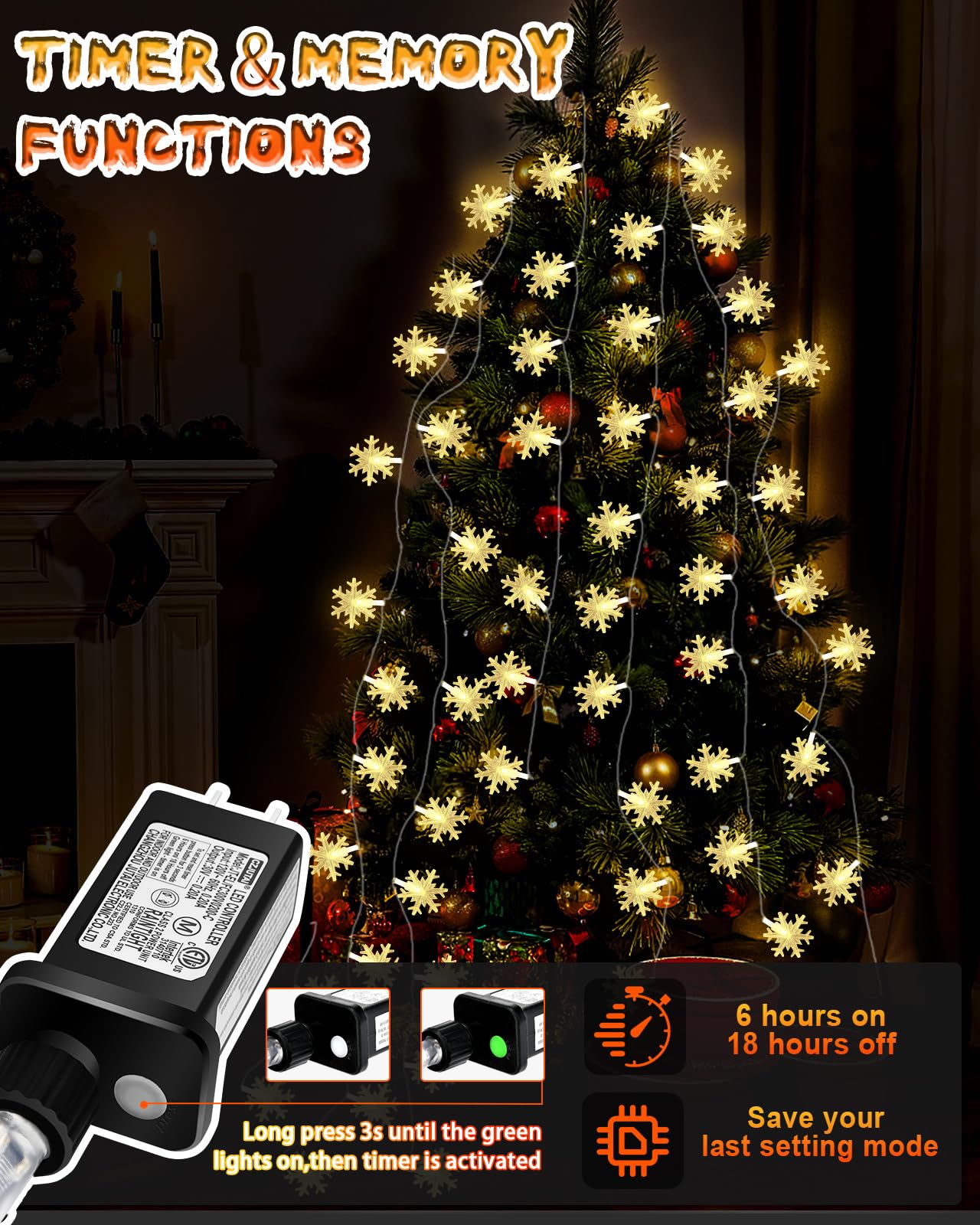 Christmas Snowflake String Lights Outdoor, 100 Led 49Ft Icicle Lights Waterproof With 8 Modes Timer Xmas Decorations, Plug In Fairy Lights For Curtain, Eaves, Window, Tree, Garden, Yard- Warm White