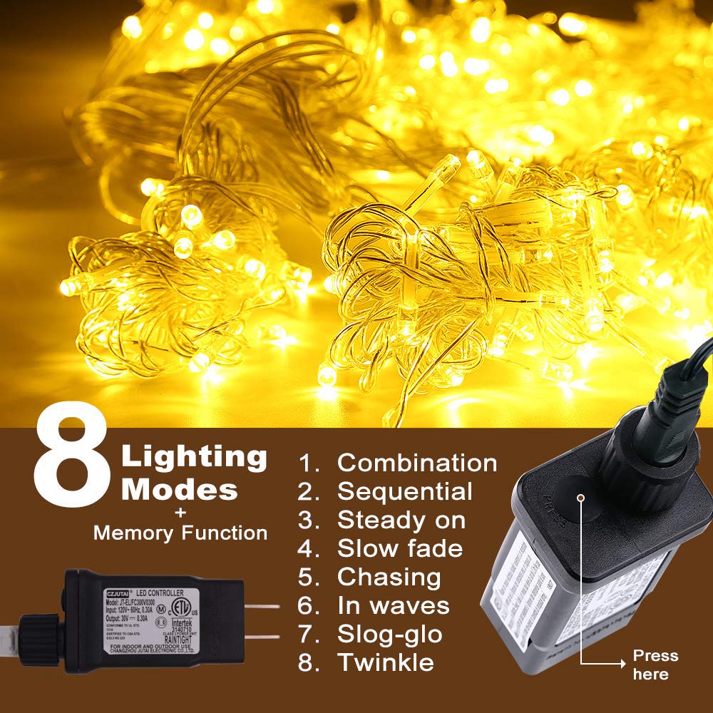 Features ? This fairy light is completely Certified (including String Wire, LED Bulbs and Plug) and really safe low voltage 29V transformer for safe use in your home. ? These lights will not overheat and you can leave them on for days. ? These lights will last a long time and you don't need to keep on buying new ones year after year. ? These lights are waterproof except the plugs, so you can leave them on in any weather. ? They are very easy to use and install, Just plug them in and they are ready to dazzle. ? 8 modes for choosing: Combination, In Waves, Sequential, Slo Glo, Chasing/ Flash, Slow Fade, Twinkle/Flash, Steady On