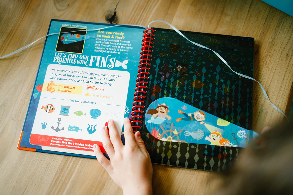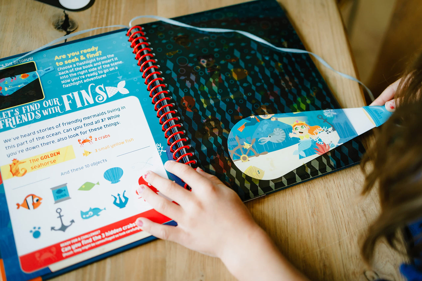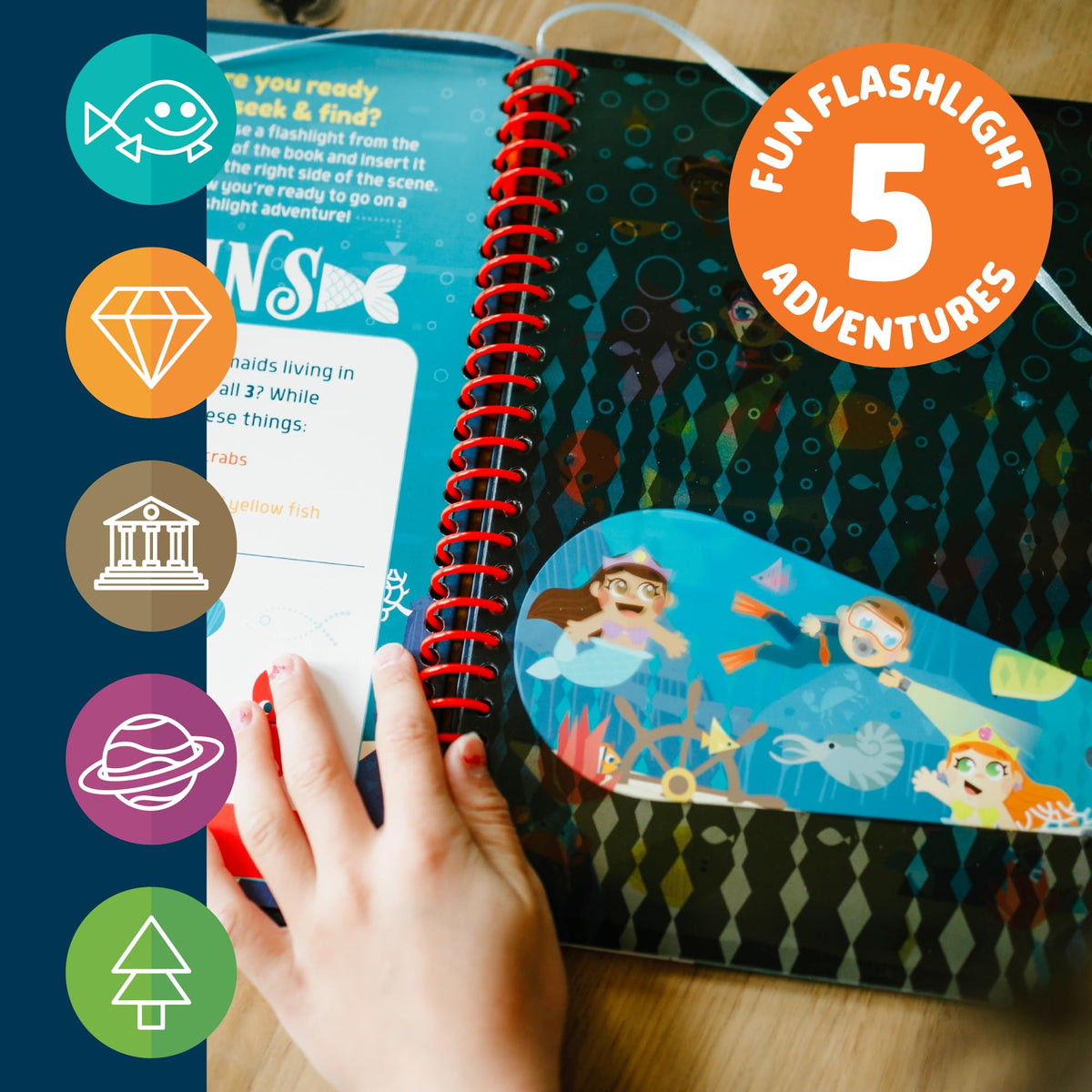 In Flashlight Seek & Find little adventurers use a flashlight to explore and search for hidden objects within five unique scenes! Select one of four difficulty levels and watch as objects appear magically in the light! Delve underwater and find creatures of the deep. Embark on a quest for jewels and riches on the pirate's bountiful beach. Get some fresh air at a campsite where you are sure to find some fun forest critters. Next, check out the museum to uncover some truly awesome artifacts. Finally, rocket to Outer Space with some of your best buds and discover planets, stars, and extra-terrestrial pals... not to mention the secrets of the Universe!With over 100 objects to find, this fun activity for kids is sure to produce hours and hours of pulsating (but quiet!) adventure!