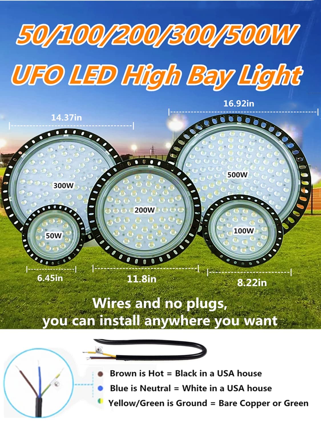 Q: How easy is it to install the 300W UFO LED high bay lights?A: The 300W UFO LED high bay lights come with an easy installation process. They can be set up in about 2 minutes by following the included installation manual. The lights feature a 180° adjustable bracket that allows for flexible positioning, making them suitable for various installation angles.