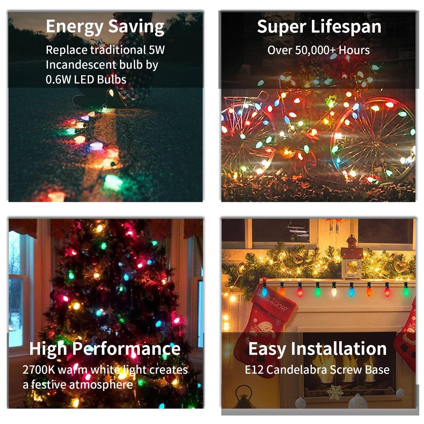 1. Vibrant Holiday Lighting: The C7 Multicolor Christmas Light Bulbs Add A Joyful, Colorful Ambiance To Any Space, Perfect For Christmas Trees, Patios, Gardens, And Even Weddings And Parties. 2. Shatterproof And Safe: Designed For Safety, The C7 Christmas Light Bulb Replacement Features Shatterproof Materials, Making It Suitable For Both Outdoor And Indoor Installations. 3. Classic C7 Style With Modern Efficiency: The C7 Led Christmas Bulbs Combine Nostalgic Charm With Energy-Saving Led Technology, Perfect For Creating A Warm, Festive Glow While Ensuring Longevity. 4. Perfect For All-Year Decor: These C7 Led Bulbs Are Ideal For Various Occasions, From Holiday Celebrations To Weddings, Providing Vibrant Lighting For Year-Round Events With Their Durable, Waterproof, And Shatterproof Construction. 5. Long Lifespan: Each C7 Led Bulb Provides Up To 50,000 Hours Of Reliable Lighting, Reducing The Need For Frequent Replacements And And Providing Enduring Holiday Lighting. 6. Year-Round Decorative Use: Versatile For Multiple Occasions, These C7 Led Bulbs Are Ideal For Everything From Christmas And Holiday D Cor To Weddings And Outdoor Parties, Providing Vibrant Lighting Throughout The Year