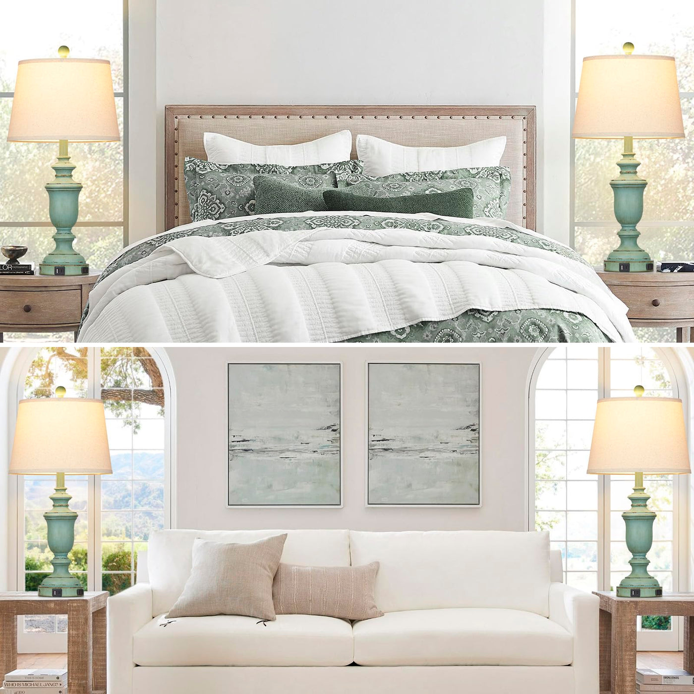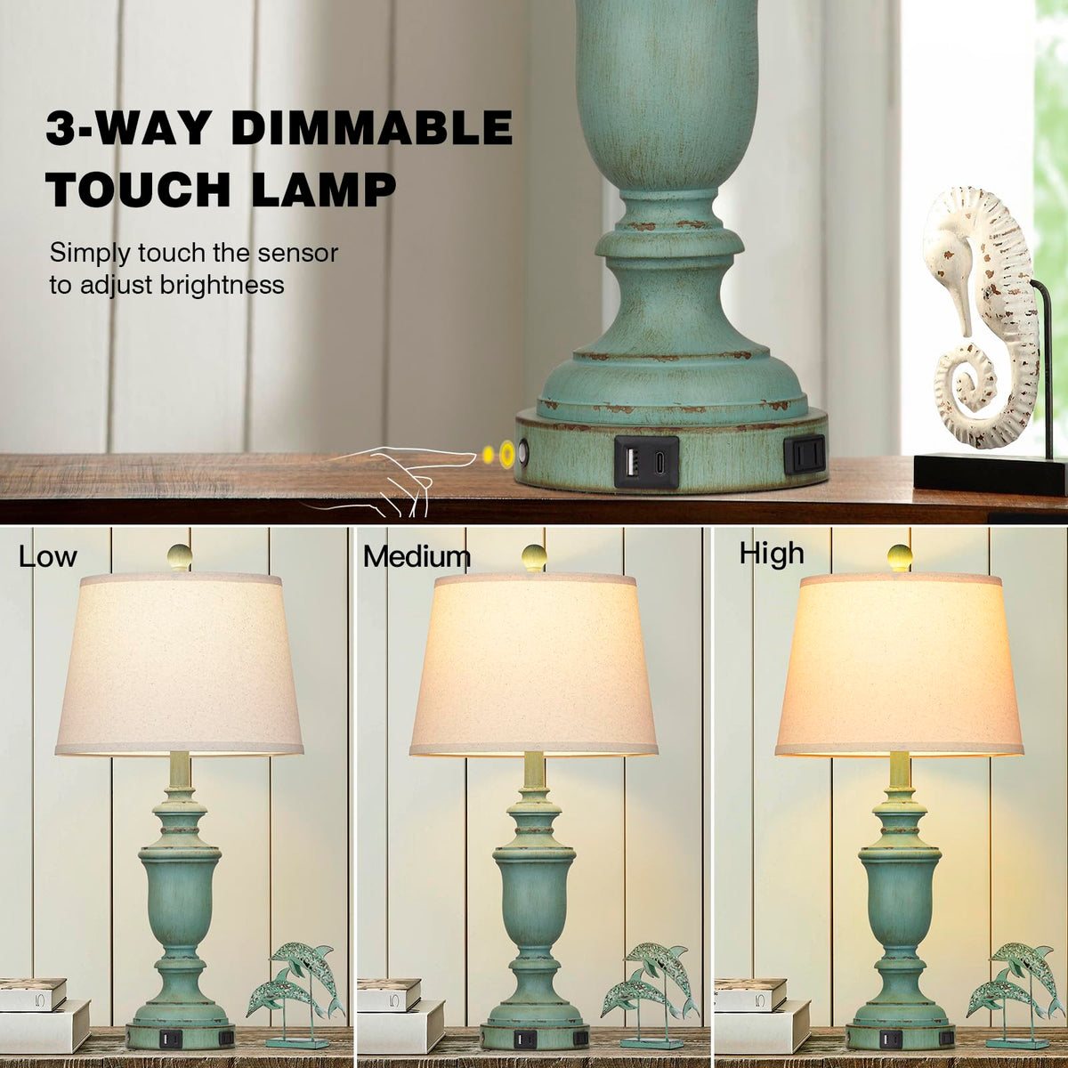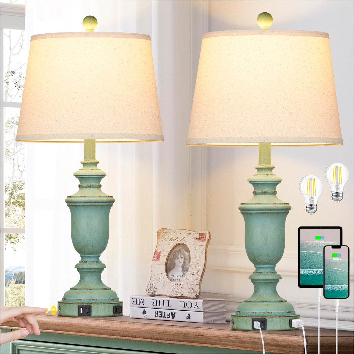 Cinkeda 25.6'' Farmhouse Table Lamps Set of 2 with USB C+A Ports & AC Outlet for Rustic Living Room Retro Bedroom,3-Way Dimmable Touch Lamp Bedside Lamps for Nightstand Side End Table,Retro Green