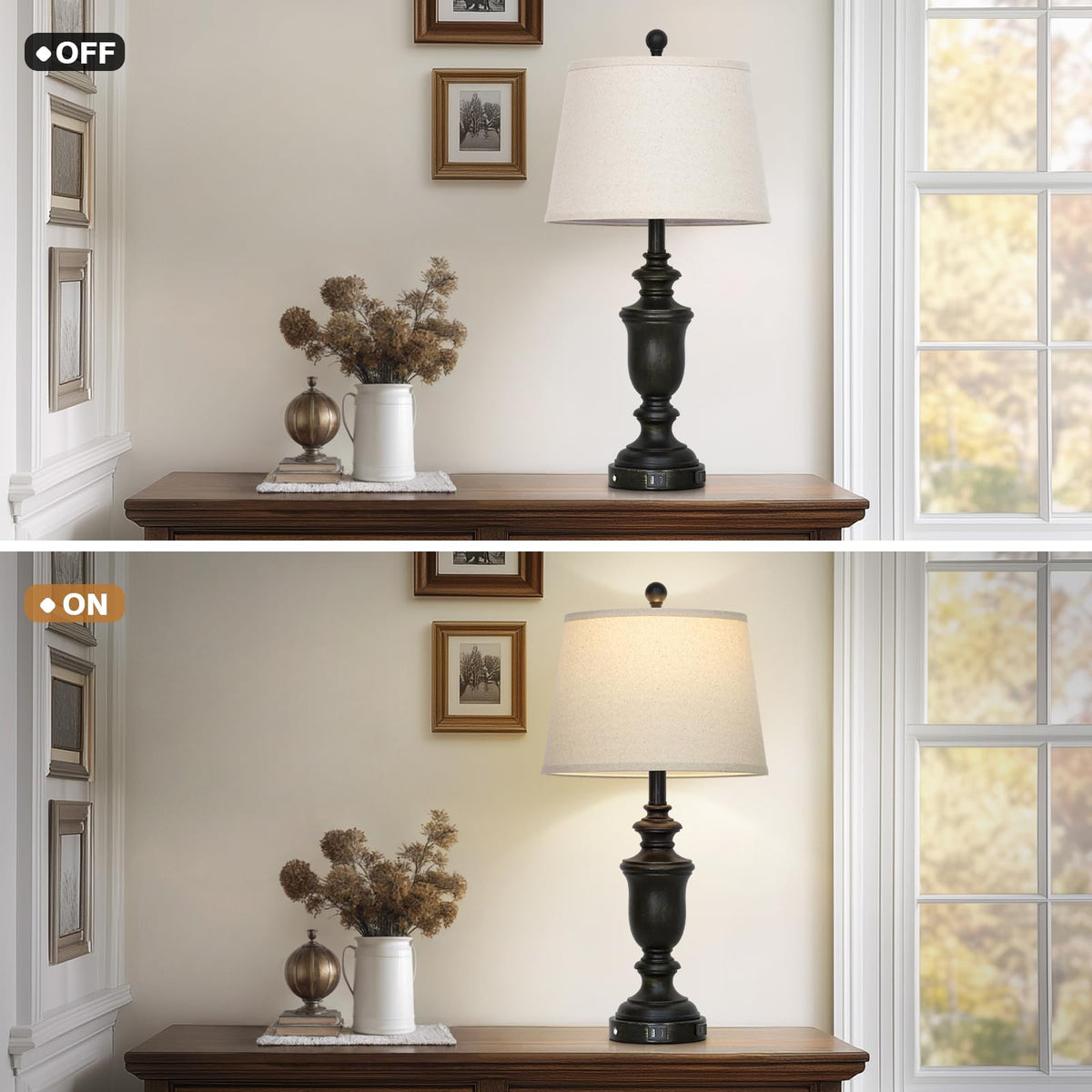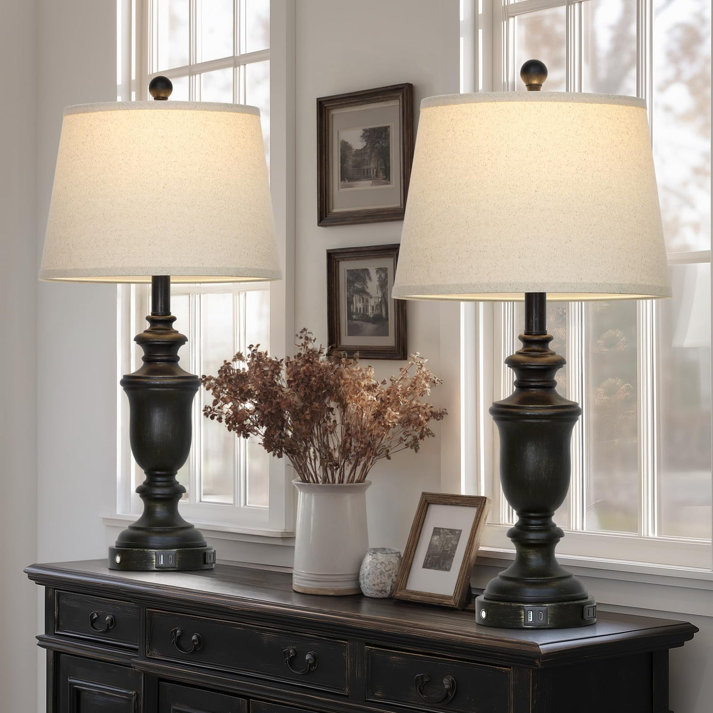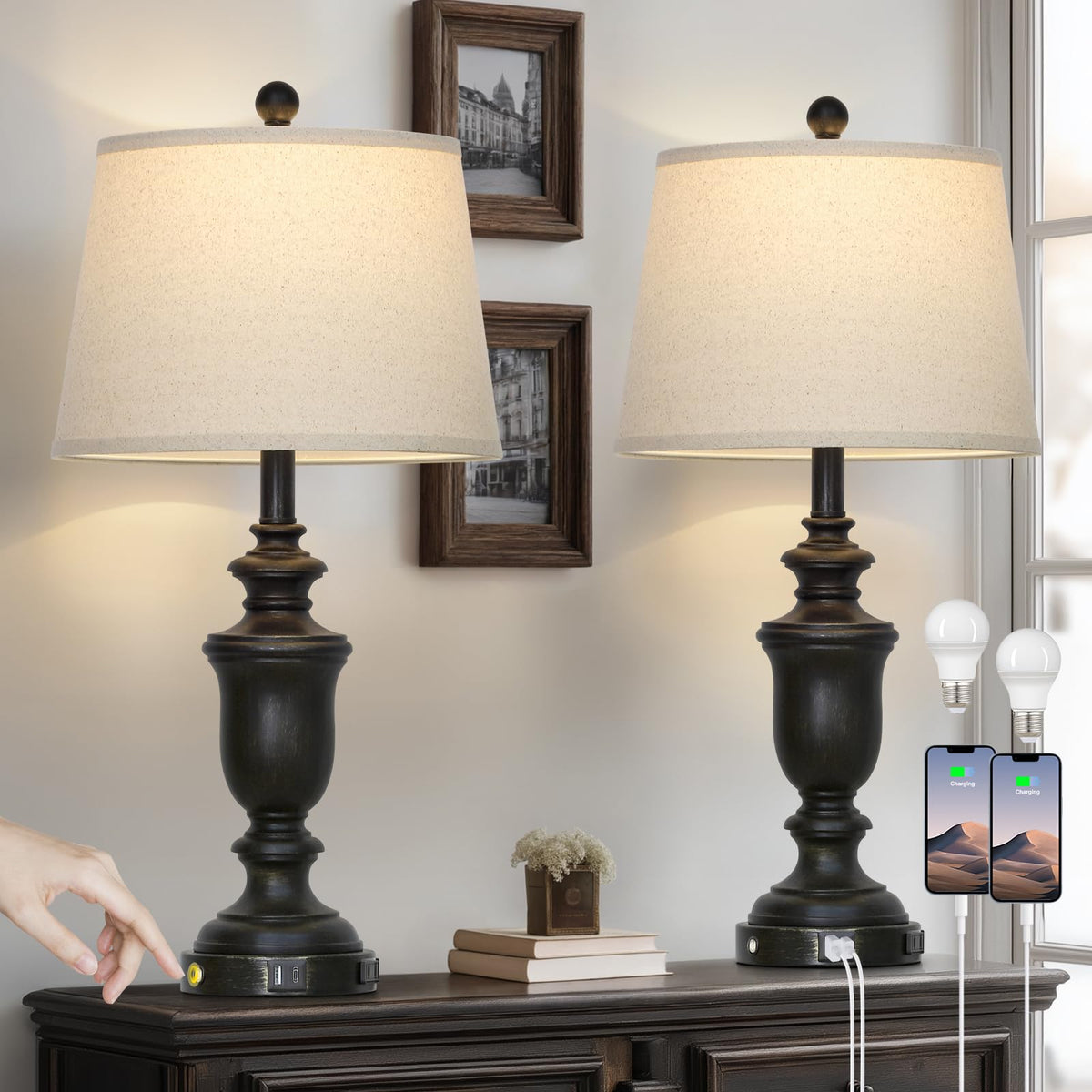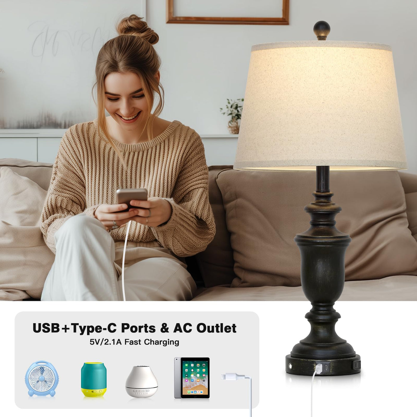 3-Way Dimmable Touch Lamps: Our retro bedroom lamps set of 2 has a built-in sensitive sensors,You just need to tap touch control switch of the base to adjust 3 level brightness and turn it on/off. Low-level is a perfect nightlight for sleeping or nursing, mid-level is ideal for daily use, and high-level is excellent for reading, studying and working.It can make you get rid of the trouble of fumbling the switch in the dark, perfect for the nightstand bedside and side table. | USB A&C Charging Ports and an AC Outlet- Our living room lamps contains built-in USB A & USB C (5V/2.1A) charging ports that make it simple to charge devices at your nightstand. It also has a single AC Outlet(2-Prong) that frees up the space in your outlet wall. Regardless of whether the lamp is on or off, you may charge your phone, Kindle, headphone, diffuser, speakers, or other electrical devices. | Unique Design: The design concept of this vintage lamp is based on the look of a trophy, and the antique resin body and oatmeal shade give this lamp an elegant style that creates a unique and classy ambiance in the living room by the sofa, at the entrance table, in the dining room and in the bedroom. | 2 LED Bulbs for Bonus: With the purpose of saving your time to look for compatible bulbs, our living room lamps set of 2 included 2 dimmable bulbs. It has longer life but less energy consumption than traditional bulbs, which helps you save at least 90% on electricity bills. Natural oatmeal-colored lampshade softens the light and provides comfortable and natural light, no flicker, no dazzle, has an effect on preserve eyesight. | 36 Months Warranty & Quick Service Response: We are strict about the quality of bedside table lamp. All touch lamps for bedrooms have passed the UL standard testing to ensure product safe. Any problem or inquires, please don't hesitate to contact us directly via Amazon,we will provide you with a 100% satisfying after-sales service.