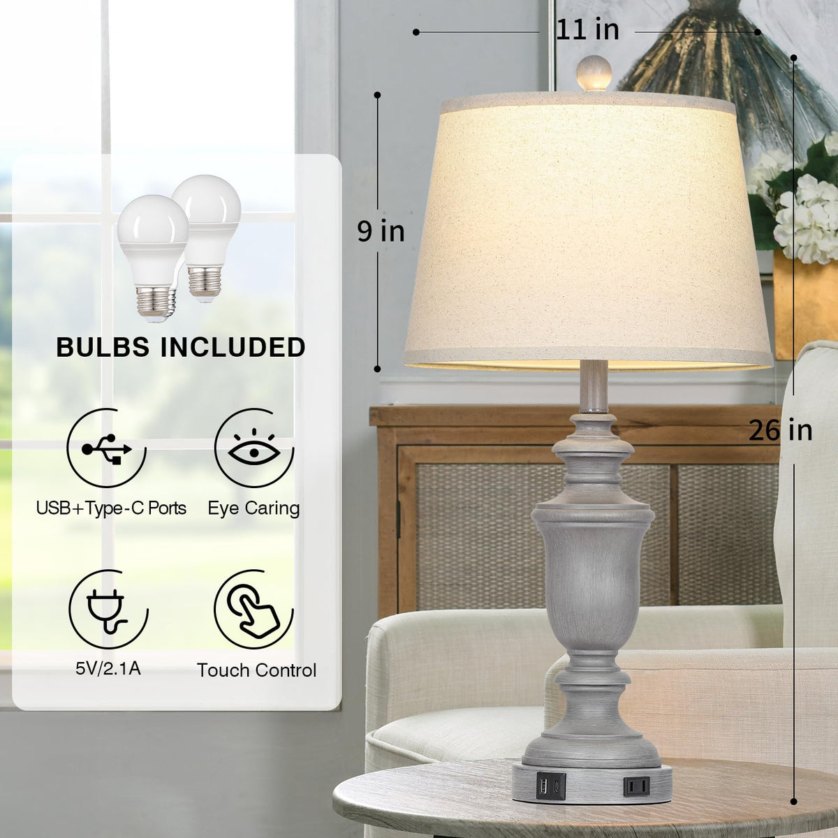 Q: What are the main features of the Cinkeda 26" Gray Table Lamps?A: The Cinkeda 26" Gray Table Lamps feature a 3-way dimmable touch control, built-in USB A & C charging ports, an AC outlet, and come with 2 dimmable LED bulbs. These lamps are designed with an elegant resin body and oatmeal shade, making them suitable for various settings, including living rooms and bedrooms.