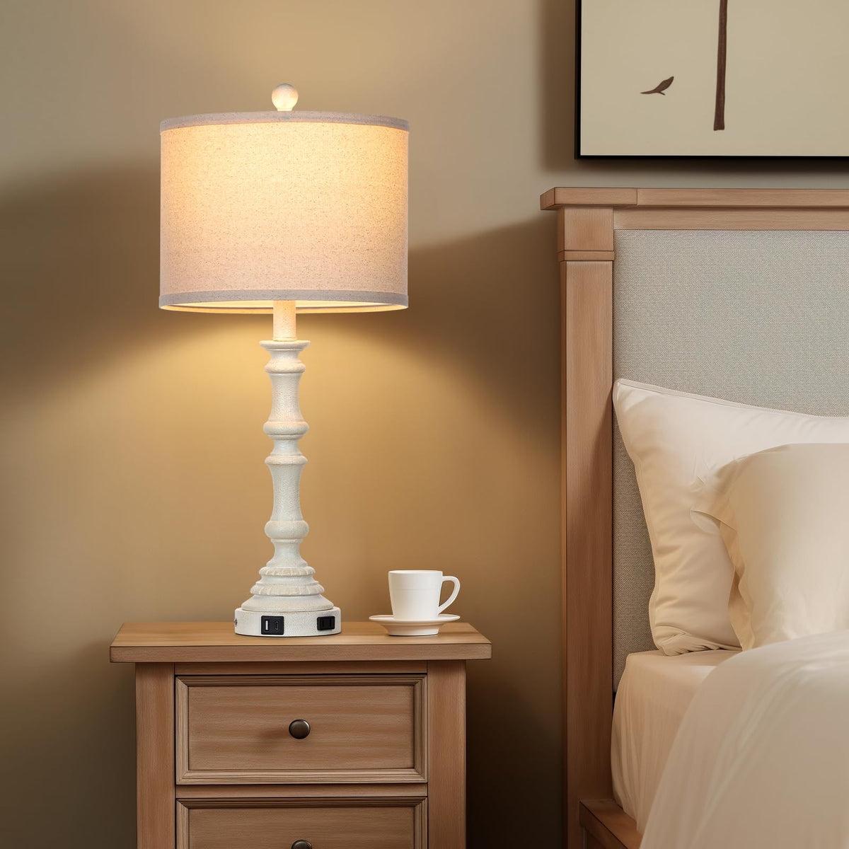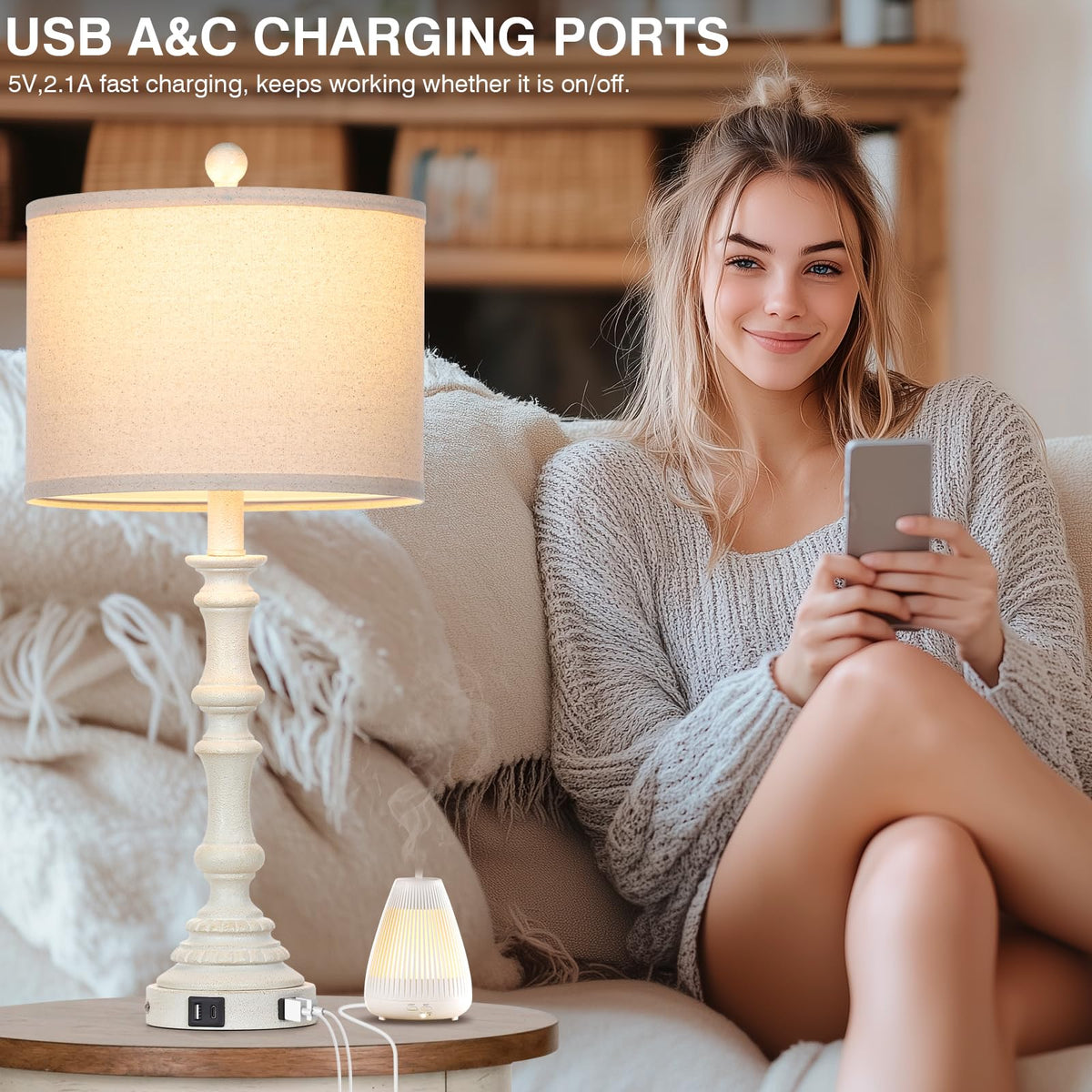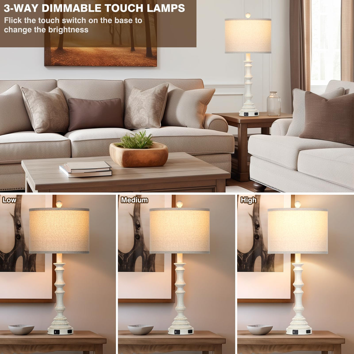 Cinkeda 27.5'' Farmhouse Table Lamps Set Of 2 With Usb C+A Ports & Ac Outlet For Vintage Living Room Retro Bedroom,3-Way Dimmable Touch Lamp Resin Bedside Lamps For Nightstand Side End Table,White-1