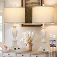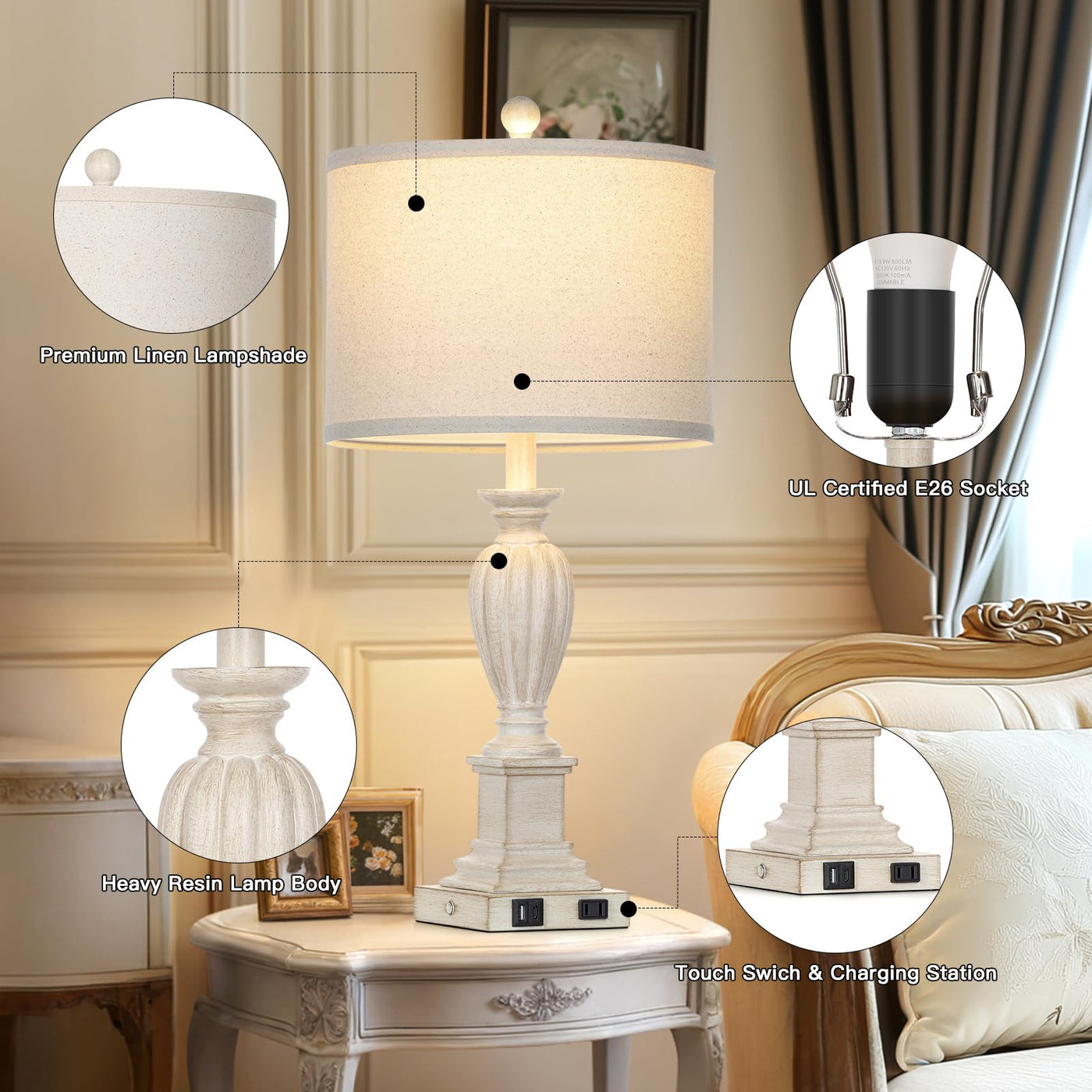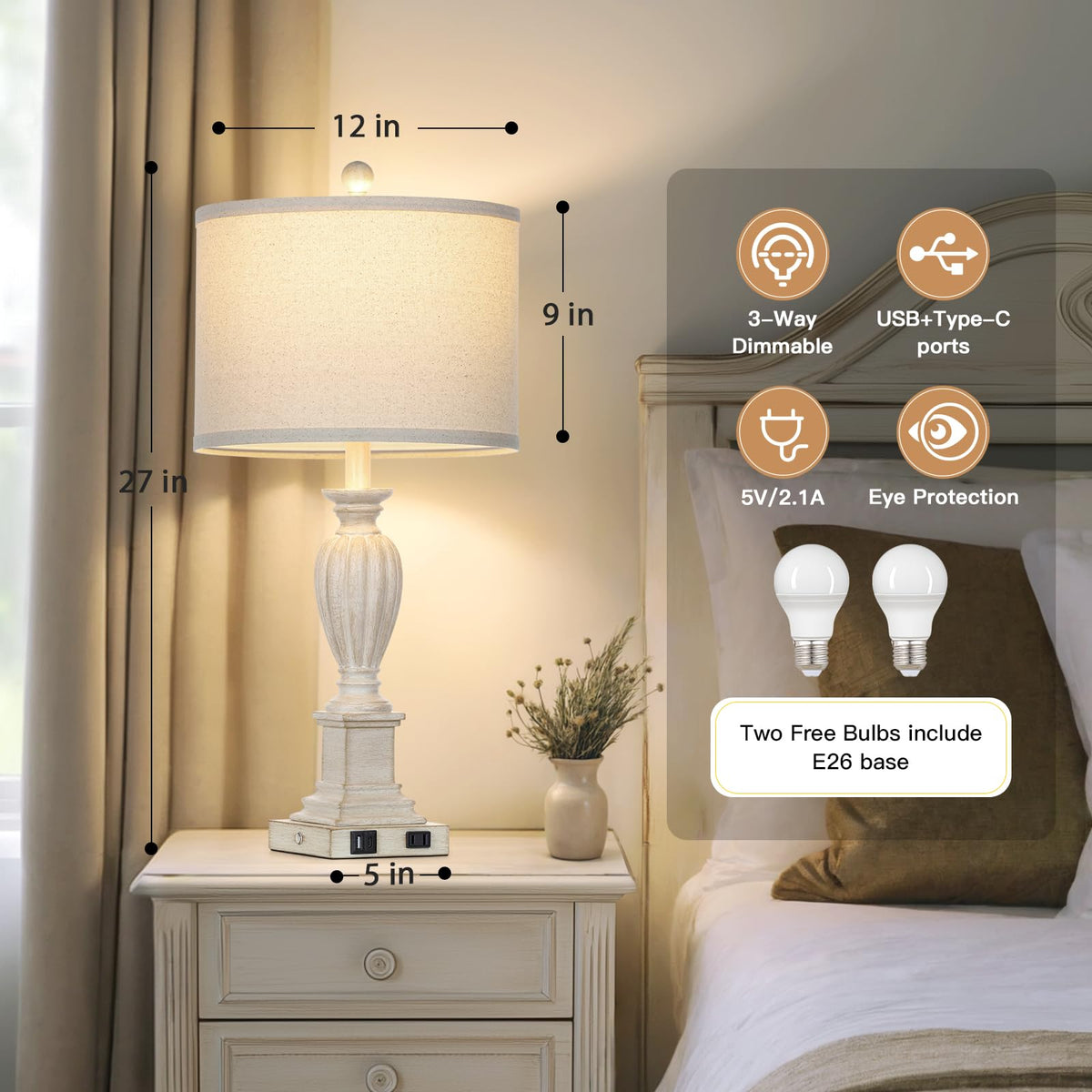 Cinkeda 27'' Farmhouse Table Lamps Set Of 2 With Usb C+A Ports & Ac Outlet For Vintage Living Room Retro Bedroom,3-Way Dimmable Touch Lamp Resin Bedside Lamps For Nightstand Side End Table,Cream