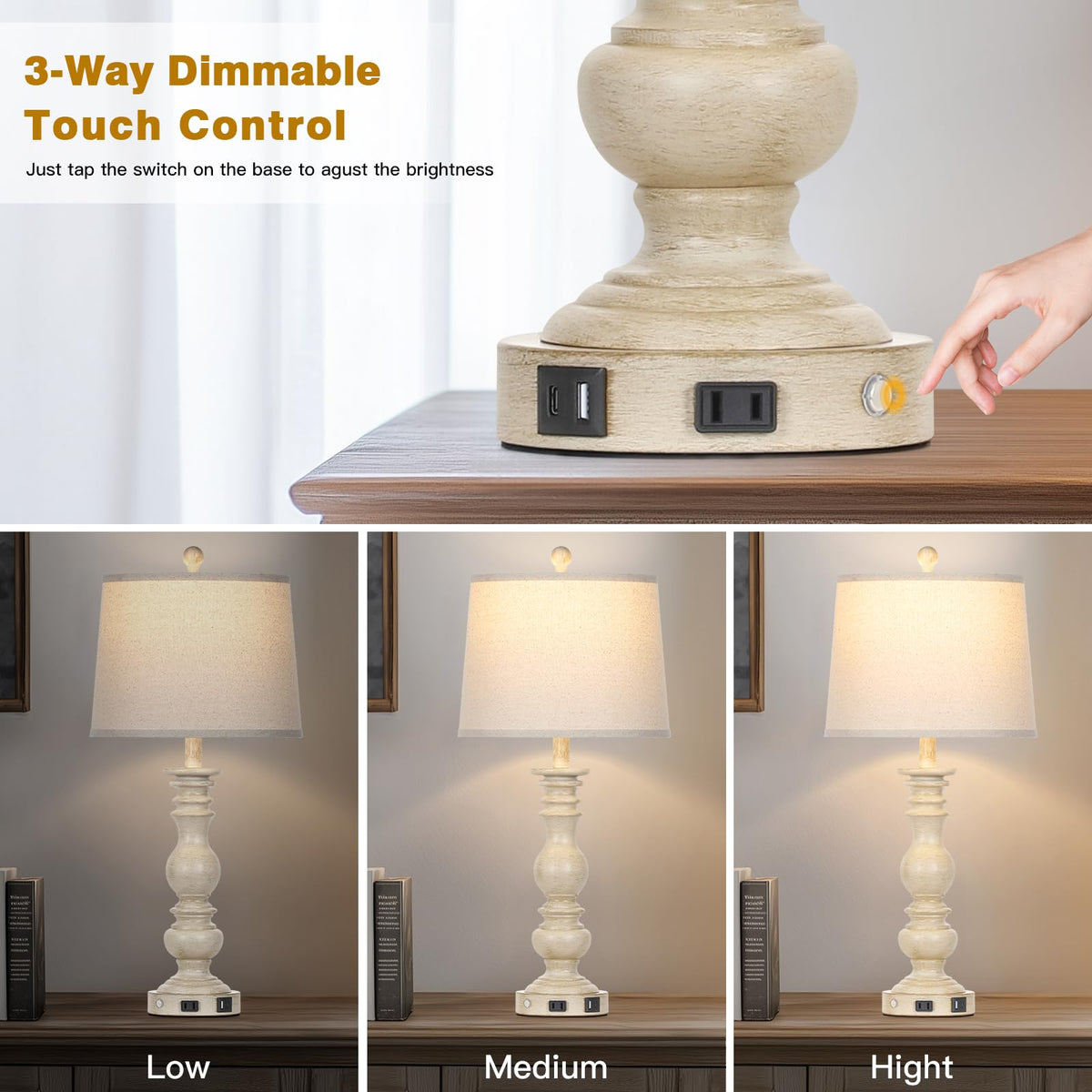 Cinkeda 28'' Farmhouse Table Lamps Set Of 2 With Usb C+A Ports & Ac Outlet For Vintage Living Room Retro Bedroom,3-Way Dimmable