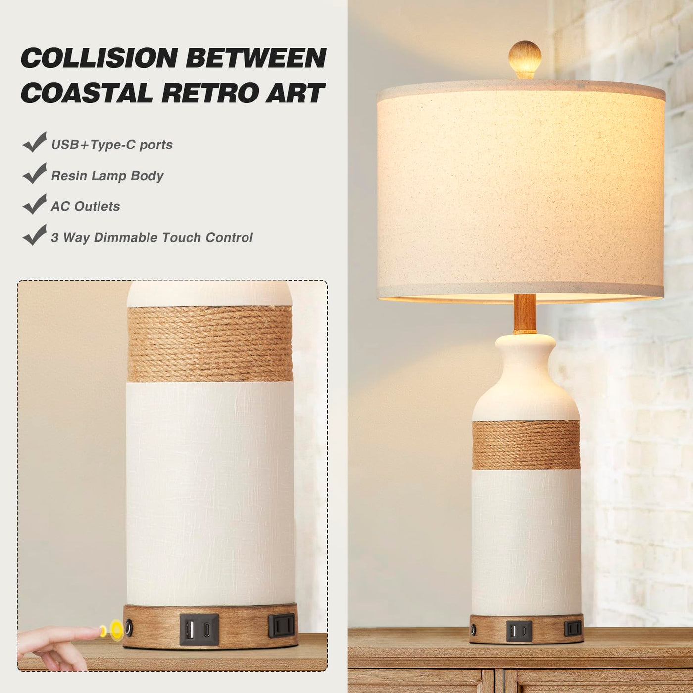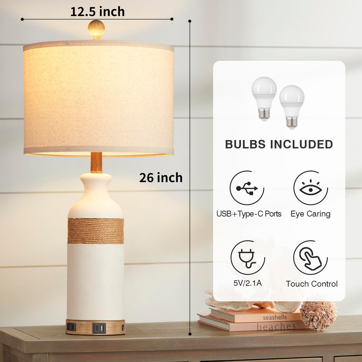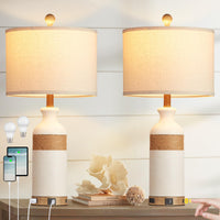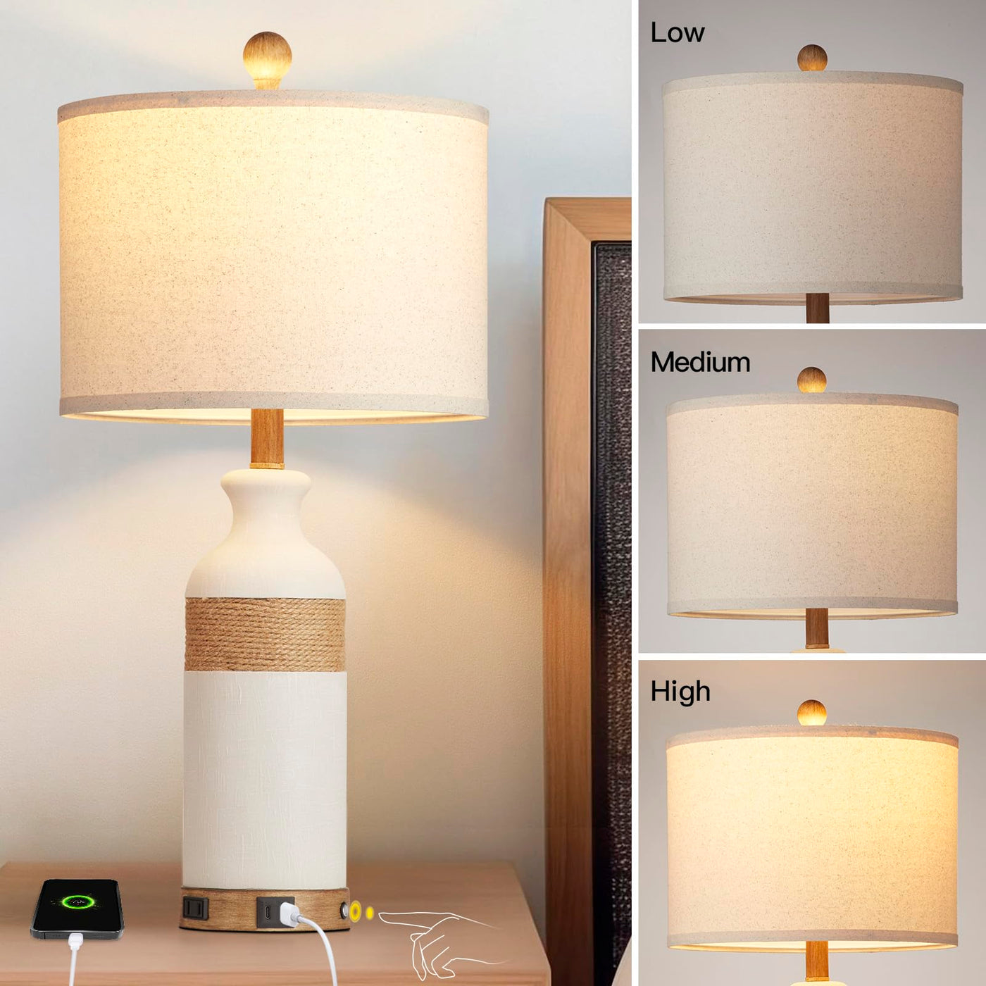 Cinkeda Boho Rattan Table Lamps Set Of 2 With Usb Ports, 3-Way Touch Control, Vintage Design