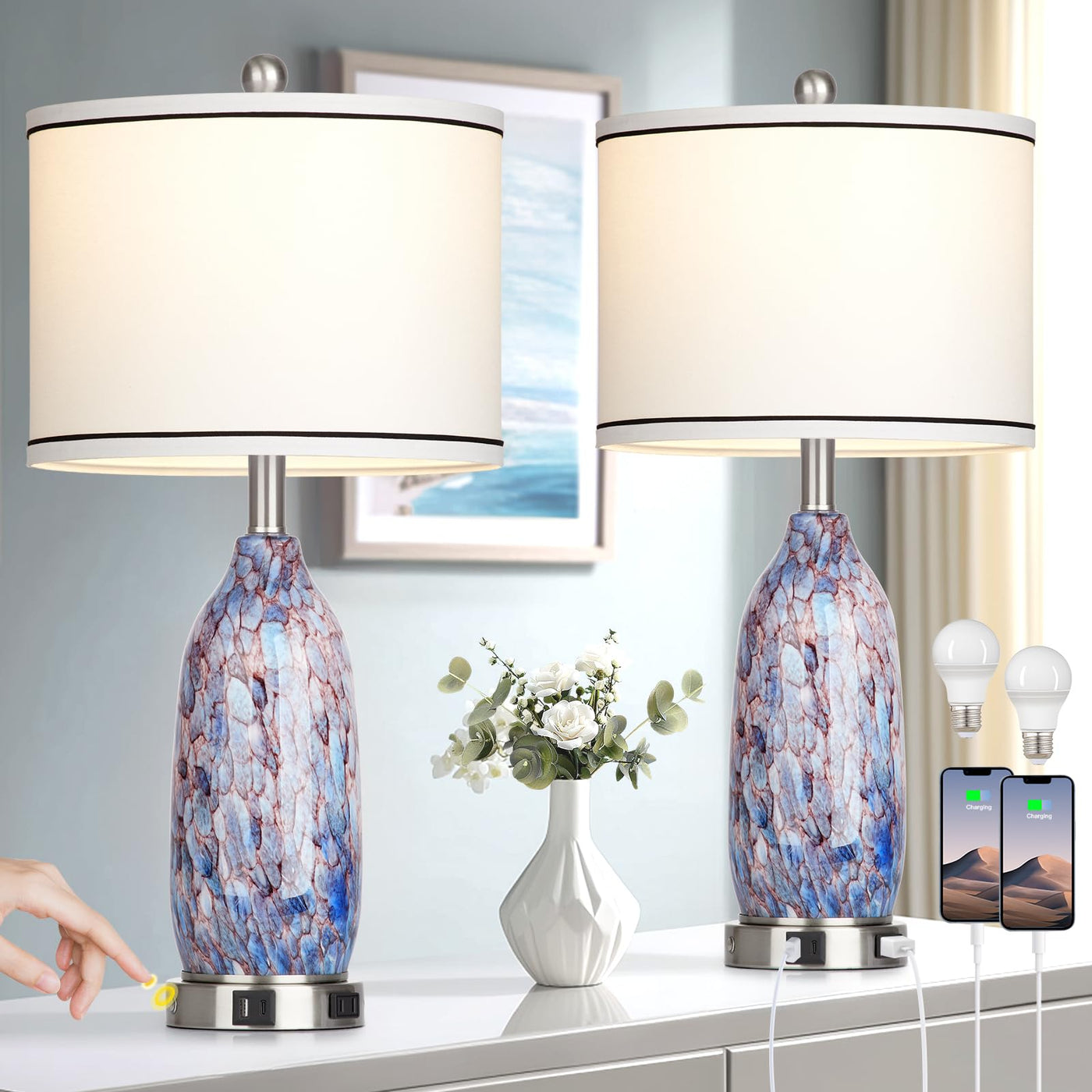 Coastal Glass Table Lamps with USB Charging- Set of 2 Transform your space with these stunning coastal lamps featuring ocean-blue textured glass and chrome accents. Perfect bedside lamps with dual-control switches for main light and touch-activated night light. Built-in USB-C, USB-A ports and AC outlet charge multiple devices simultaneously (5V/2.1A) whether lamp is on or off. No more searching for charging points! Includes energy-efficient 6W LED bulbs delivering 800 lumens of warm 2700K light with 360-degree coverage. Eye-friendly illumination perfect for reading or relaxation. These modern table lamps complement any bedroom, living room, or office. Ocean lamp design brings coastal vibes while providing practical functionality. Ideal Gift: Housewarming, wedding, anniversary, or any special occasion Set Includes: 2 * Coastal lamps, 2 * LED bulbs, user manual