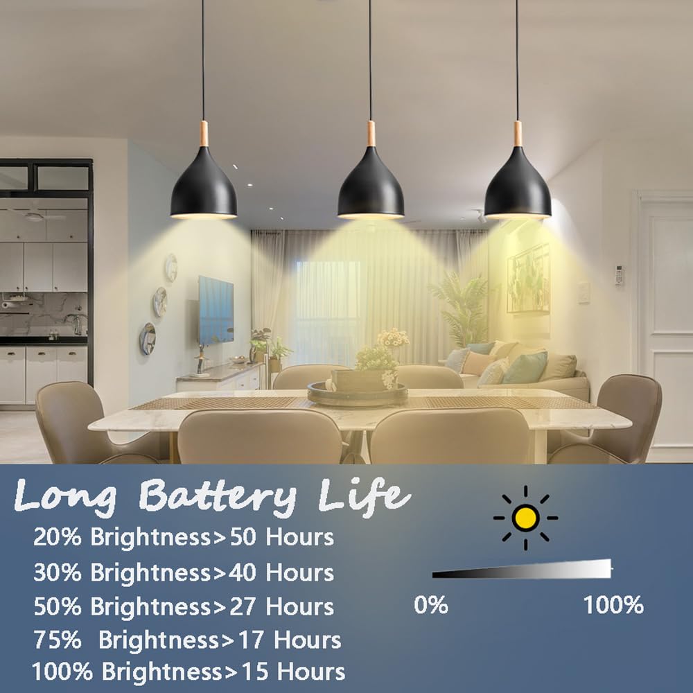 Features:1. 1. Choosing Our Rechargeable Battery Pendant Light,You Can Add New Lighting Points Anywhere. No Need To Wire, Just Hang The Light Wherever You Want To Decorate And Light Your Home.2. The Bulb Built-In Batteries And Rechargeable,Usb Charging 7-10 Hours Full Charge,Up To 30 Hours Of Continuous Use (Minimum Brightness).3. You Can Use The Remote Control To Set The Brightness To 50% (30H+ Continuous Work) , 75% (18H+ Continuous Work), 100% (12H+ Continuous Work),Use The Direct Dimmer Button Also Can Manually Control The Brightness And Color Of The Light.Specification:Material: Iron,Woodlight Bulb Type: E27 Usb Charging (Including Bulb And Usb Charging Cable)Light Bulb Brightness: 500-700 Lumenslight Bulb Color Temperature: 3000K Warm Light,4000K Warm White Light,6000K White Lightpackage Included:Pendant Lights 3Battery Backup Light Bulbs With Remote Control 350Cm Type-C Usb Charging Cables 3Installation Note 1Note:1. The Bulb Is Powered By Battery ,Aslo Can Directly Connected To Household Electricity Use As A Normal Light Bulb.2. Please Use A High-Power Charging Plug To Reduce Charging Time.3. Please Allow An Error Of 1-2Cm And A Little Color Difference!