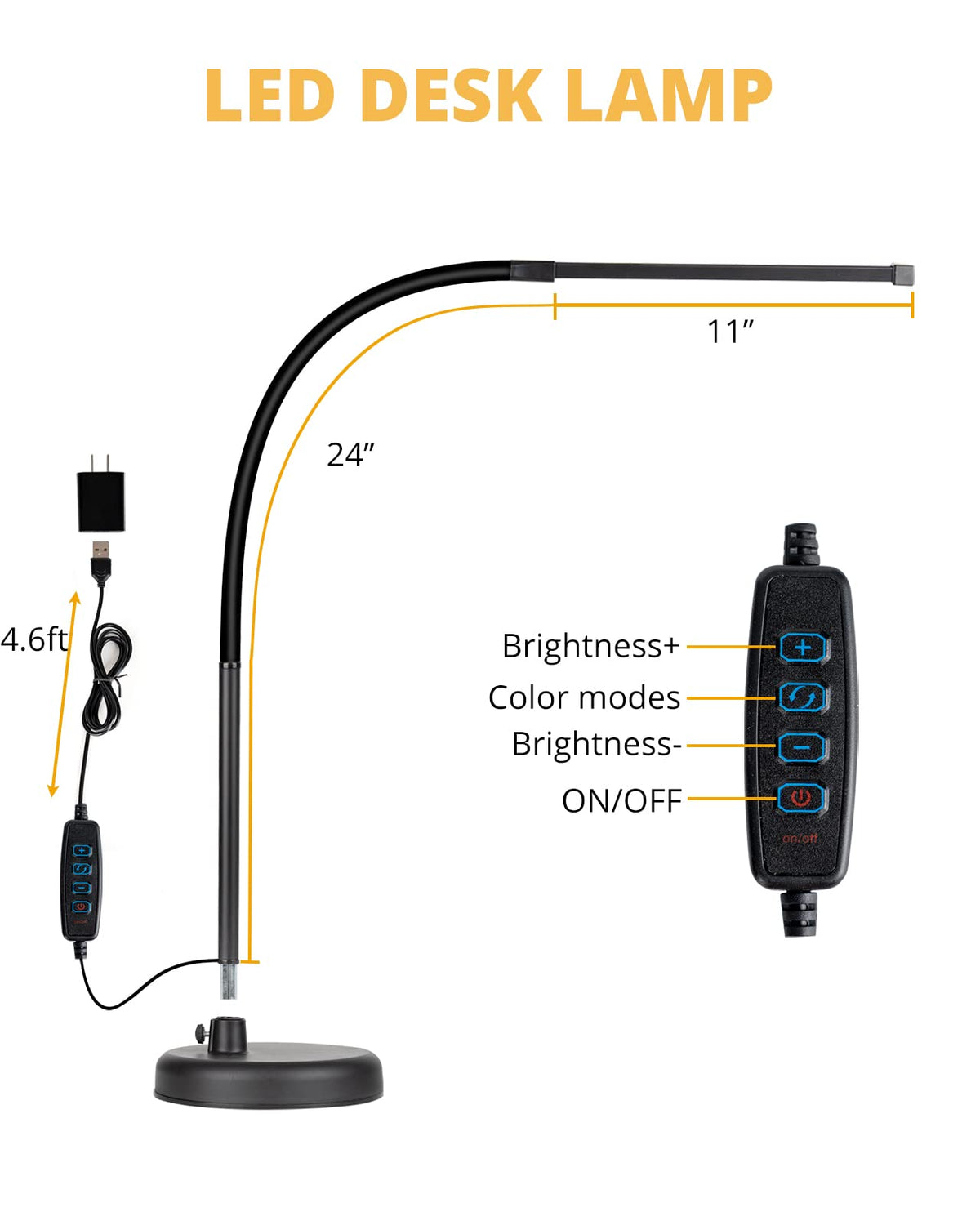 Q: What is the size and weight of the lamp?A: The lamp features a base diameter of 5.9 inches, a gooseneck length of 24 inches, and a lamp height of 11 inches. It has a stable weight of 2 pounds, ensuring it stands securely on your desk.