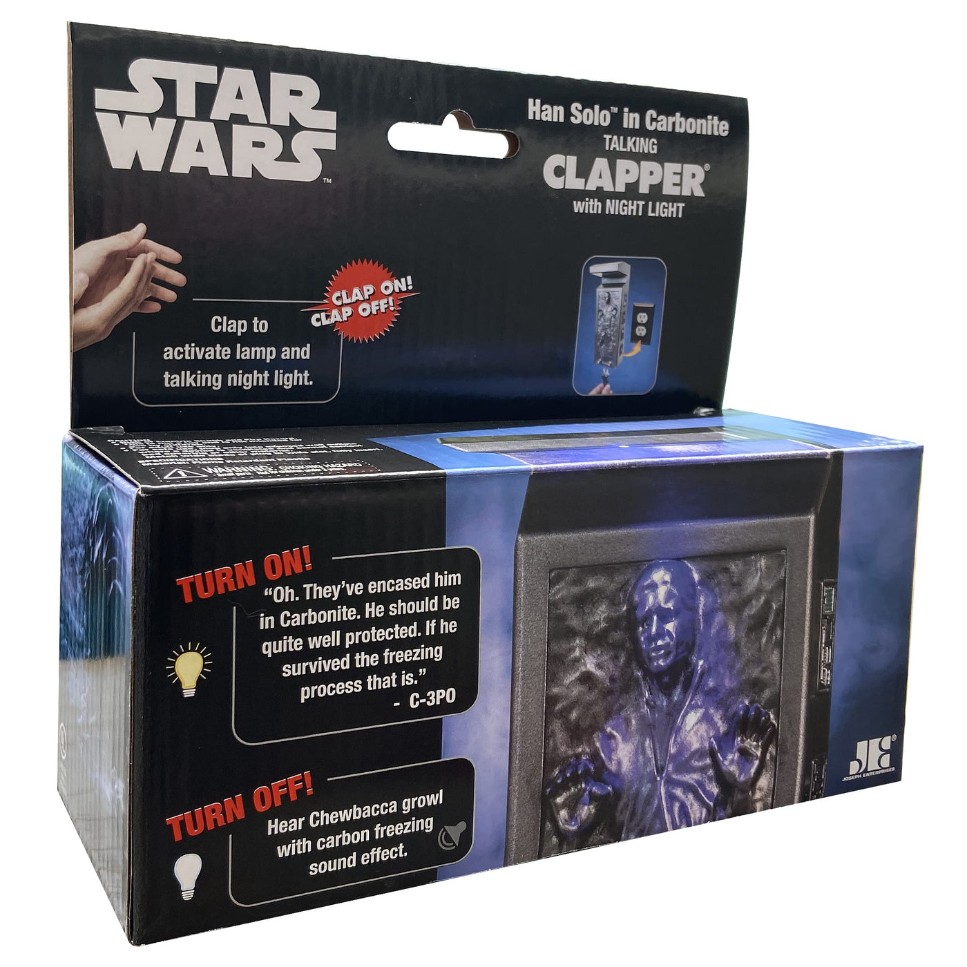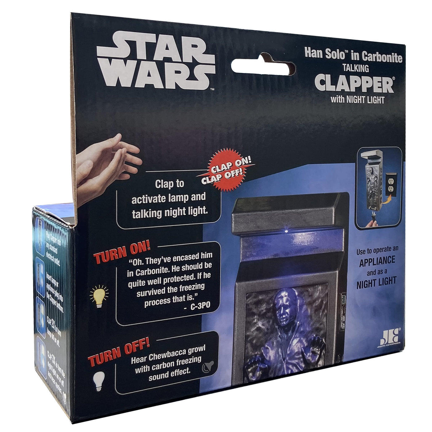 Q: What is the Clapper The Star Wars: Han Solo Carbonite?A: The Clapper The Star Wars: Han Solo Carbonite is a fun and functional talking clapper that features a night light. It is designed for fans of Star Wars and adds a unique touch to any room.