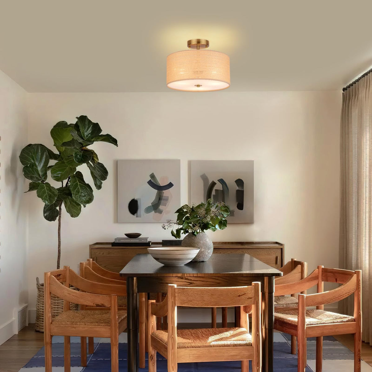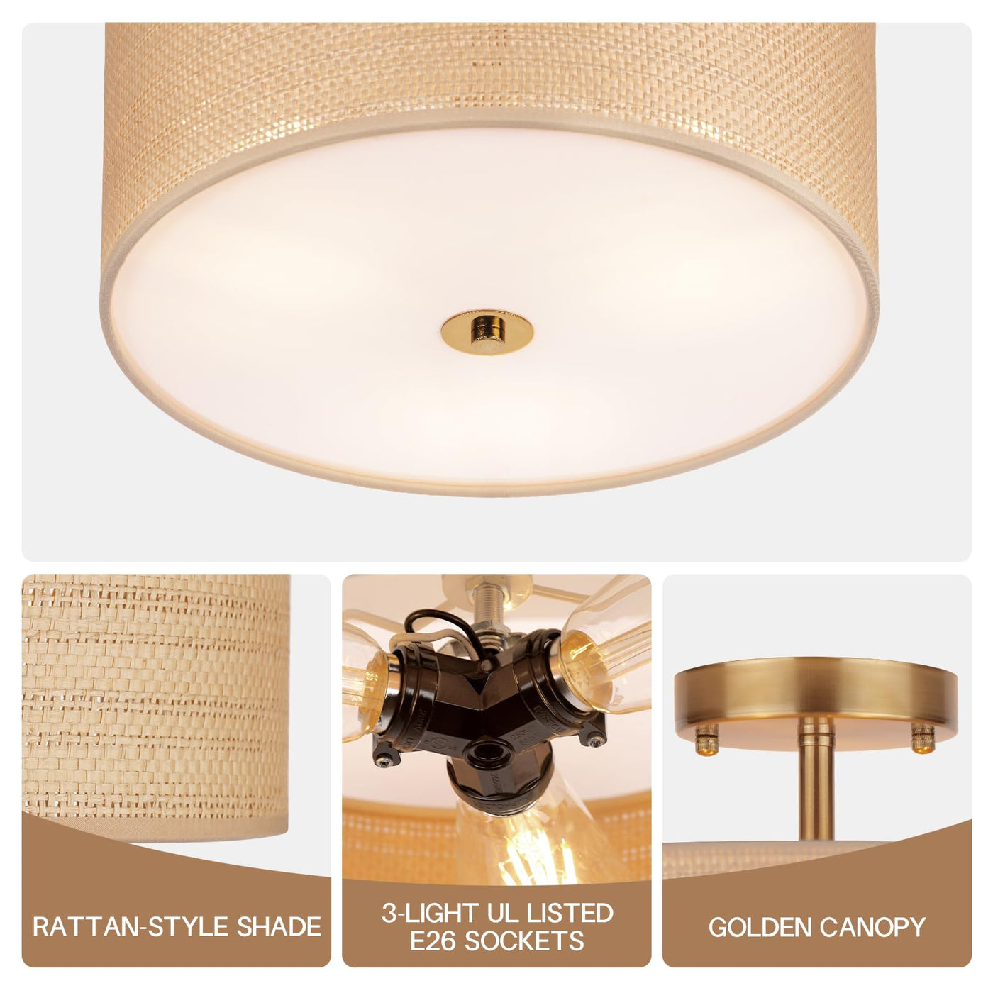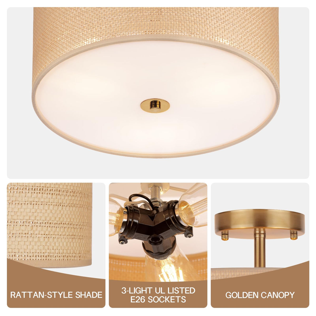 Clarsyne 13 Boho Woven Rattan Ceiling Light Fixture 3-Light Semi Flush Mount Modern Drum Lamp With Beige Fabric Shade Rustic Lighting For Bedroom Living Room Dining Room Hallway And Entryway