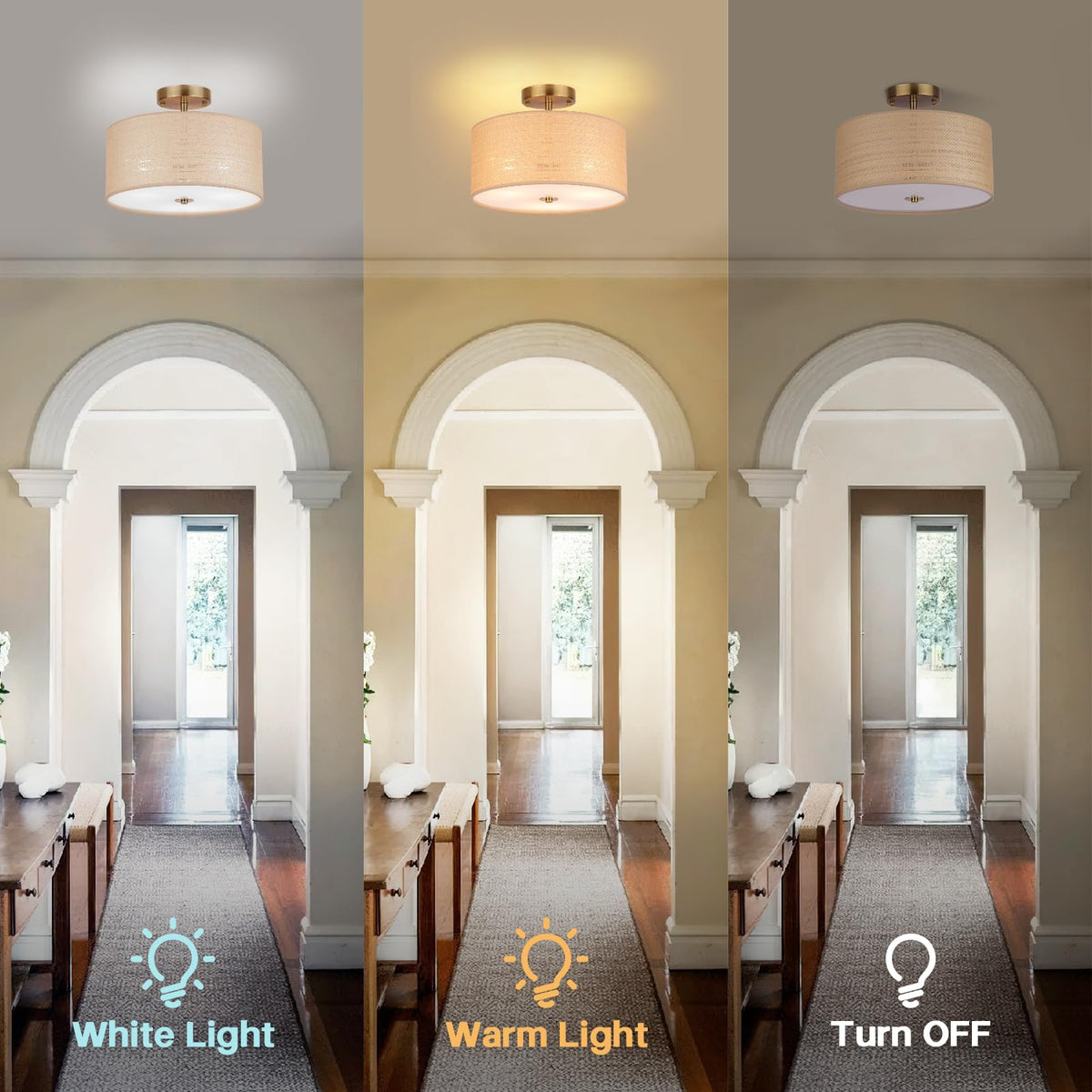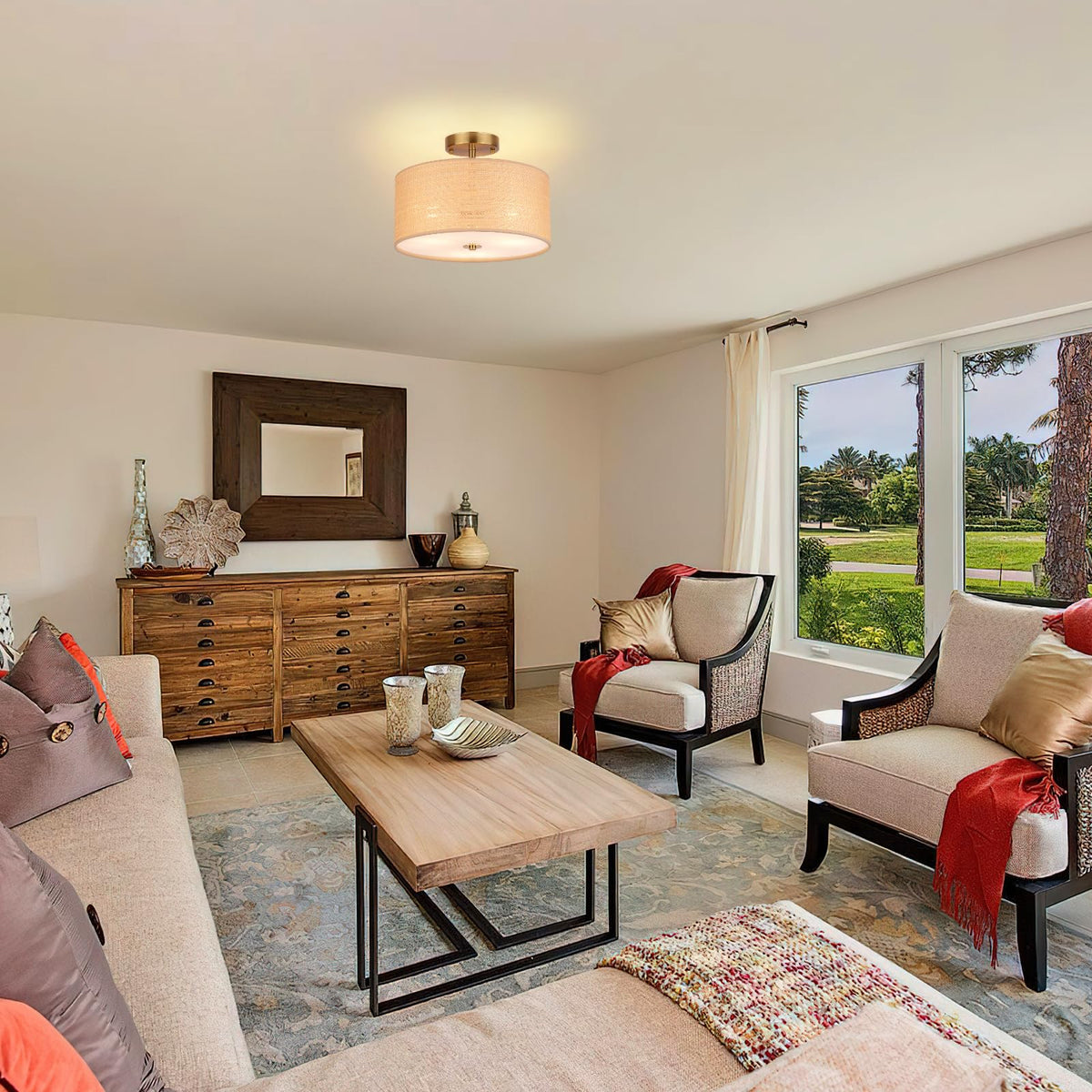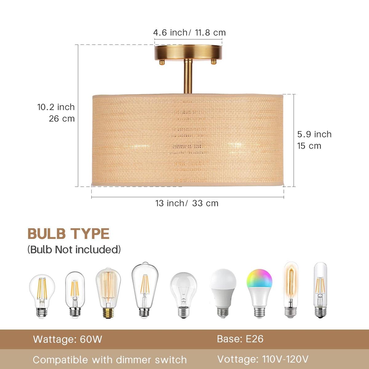 Clarsyne 13 Boho Woven Rattan Ceiling Light Fixture 3-Light Semi Flush Mount Modern Drum Lamp With Beige Fabric Shade Rustic Lighting For Bedroom Living Room Dining Room Hallway And Entryway