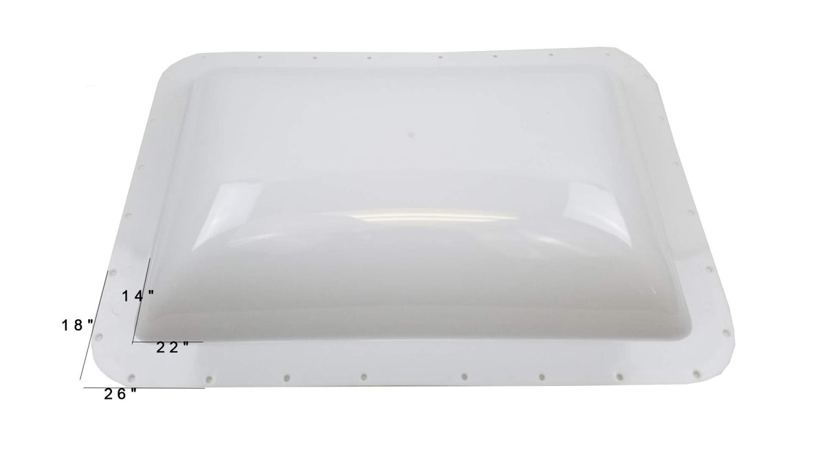 COLOR White MOUNTING FLANGE DIMENSIONS 17 7/8" X 26" Pre-drilled For Easy Mounting STICKER ON VENT will say 14" x 22" due to dome size DOME DIMENSIONS (this is roughly the size hole you will need in your unit) 14 1/8" X 22 1/8" (4 1/4" height) NO MOUNTING HARDWARE you must provide caulk/putty and screws NO GARNISH RING We do not carry interior garnish / trim / beauty rings for any of our skylights, most skylights are trimmed-out with wood like in a house. NO INSTALLATION INSTRUCTIONS MADE IN USA from shatter-proof Plastic Premium design made from 50% stronger material than ordinary RV skylights Small mark in middle of skylight from manufacturing process, does not effect skylight, all Lexan skylights will have this mark.