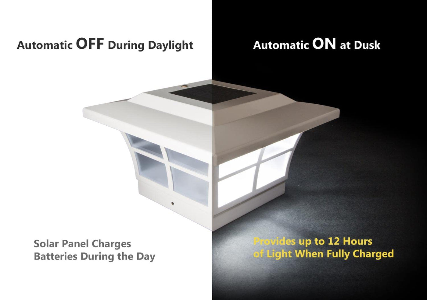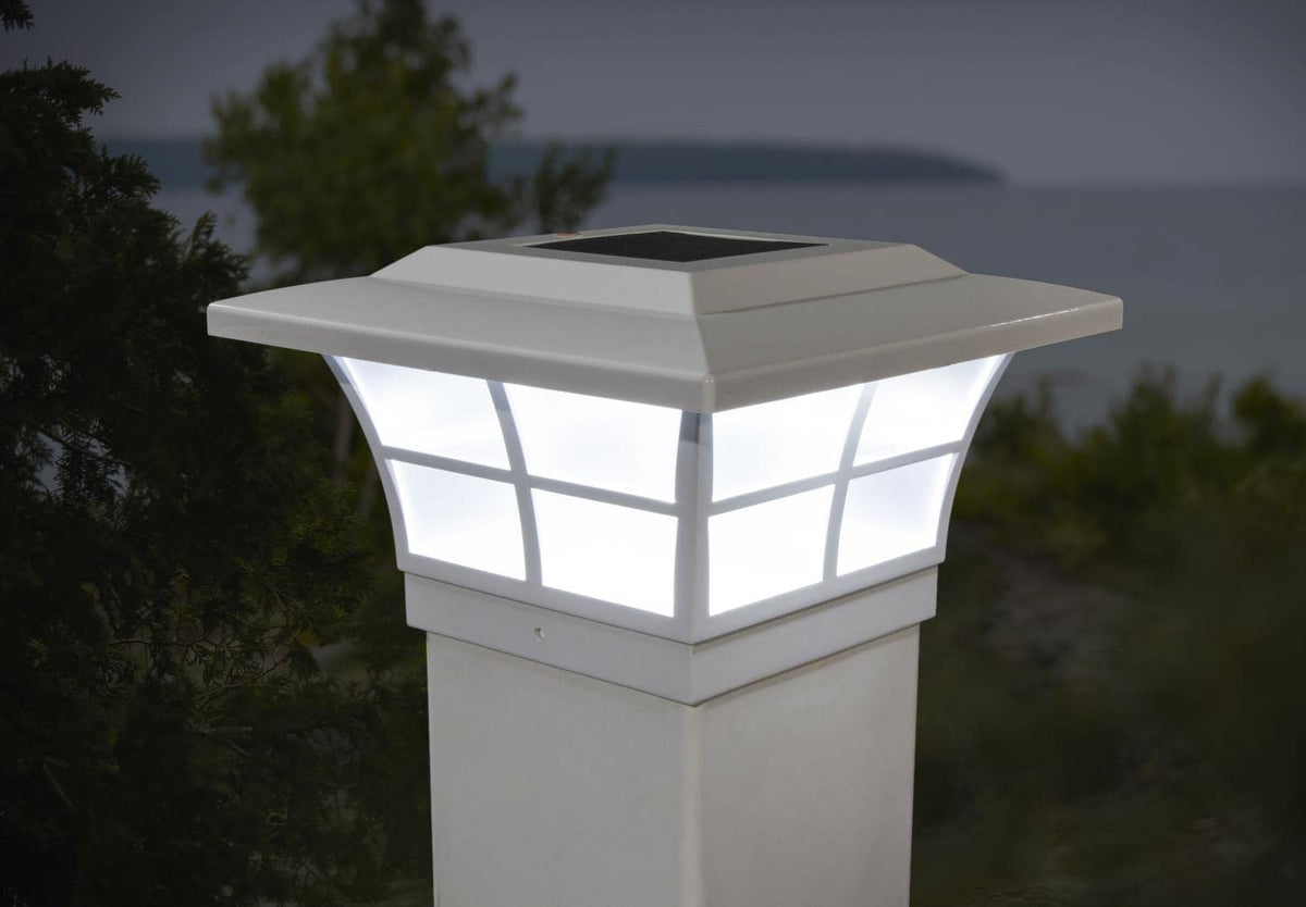 The 5x5 white PVC Prestige solar post cap is stylish and durable with performance you can depend on. Our patented window frame design and frosted lens create a unique ambience. Will fit over an actual 5"x5" or 4. 75"x4. 75" post (4. 75"x4. 75" adaptor included)
