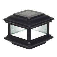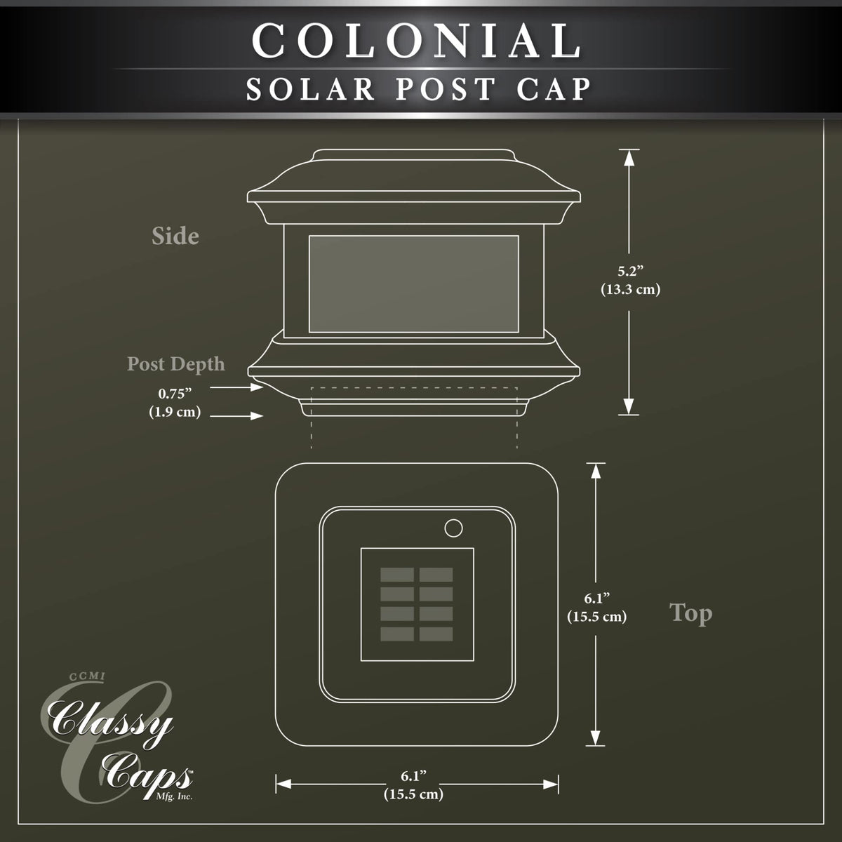 Fabricated from durable cast aluminum with powder coated finish, the Colonial Solar Post Cap is designed to fit over a nominal 4” x 4” wood post. (Actual dimension of opening: 3-5/8”x3-5/8”). The attractive Colonial is complimented by using real pebbled glass panels. Built to our stringent quality standards it will stay lit for up to 12 hours.