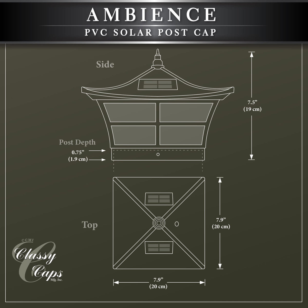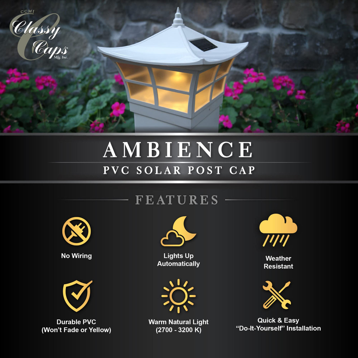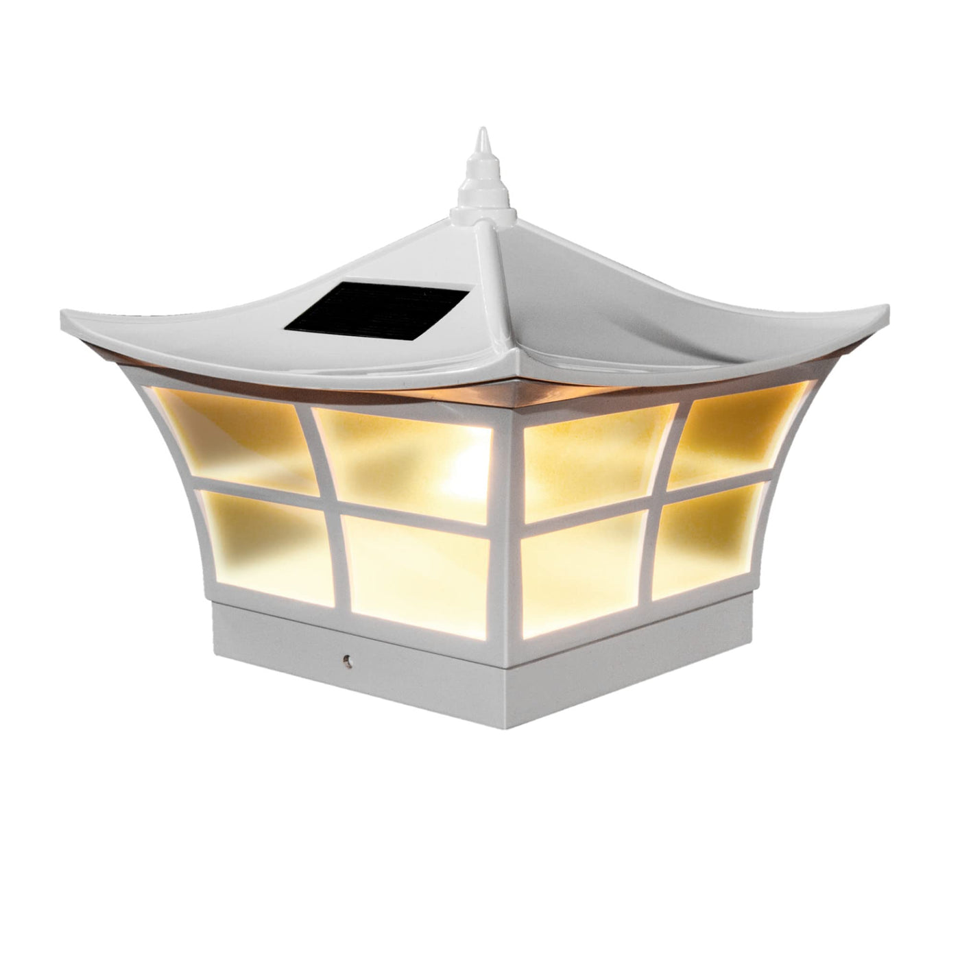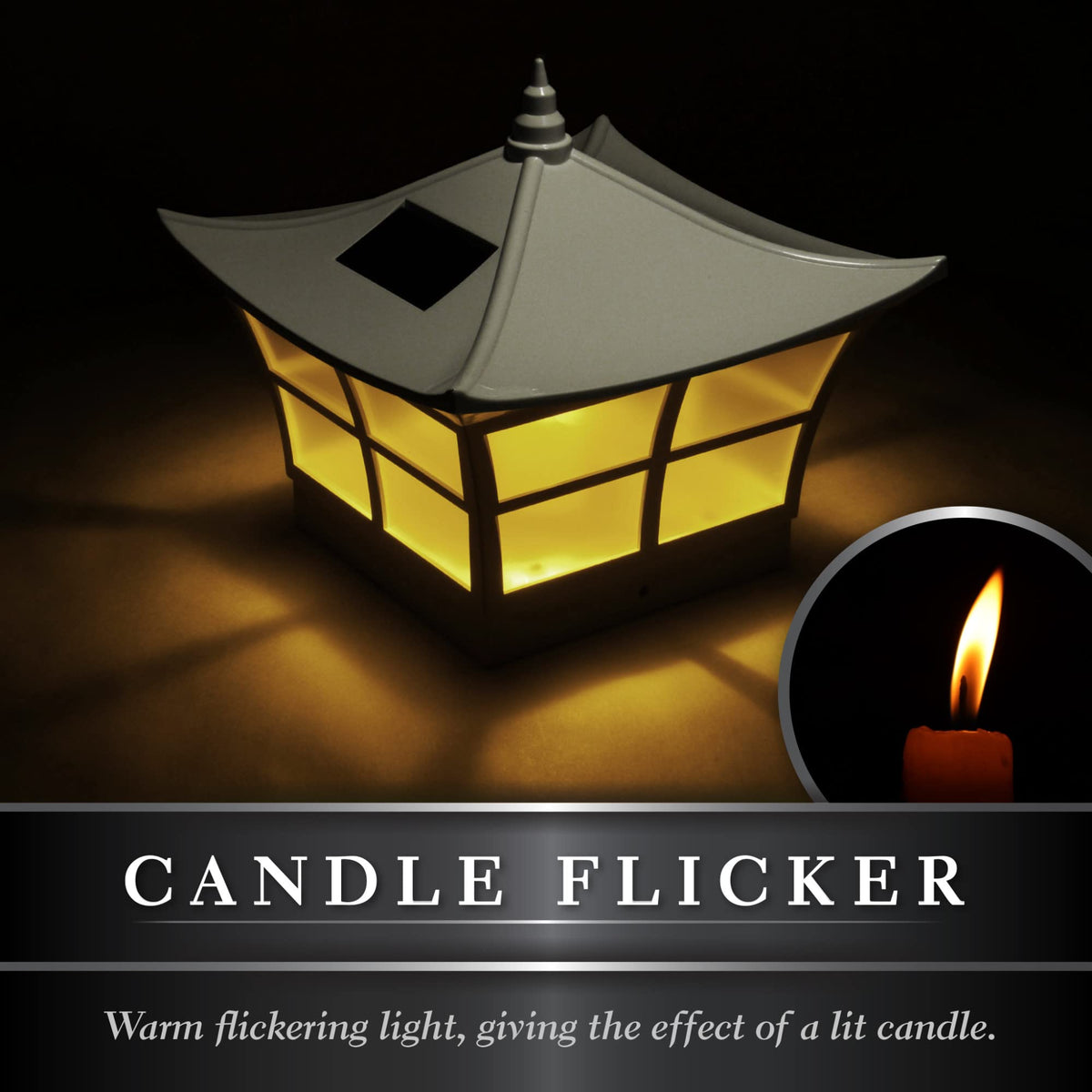 Attractively designed in a Japanese garden style, the patented 4”x4” White vinyl(PVC) Ambience solar post cap provides a warm yellow flickering light, giving the effect of a lit candle. Dependable performance with a unique style. Will fit over an actual 5”x5” or 4”x4” post (4”x4” adaptor included)