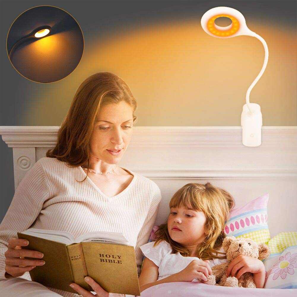 Clip-On Reading Light For Bed - Amber Book Read Light Rechargeable 5 Brightness Desk Light Clamp Lamp, Touch Control Dimmable Lamp With Flexible Neck, Gentle Night Light(White)