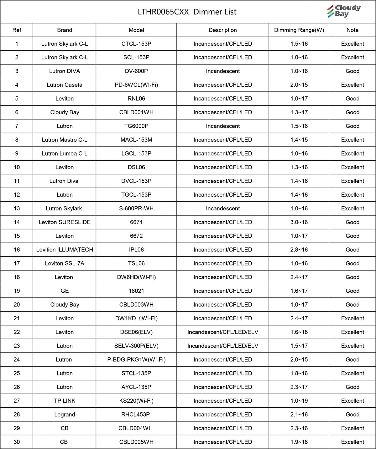 Flicker-free dimming capability from 10% to 100%, compatible with most dimmers.