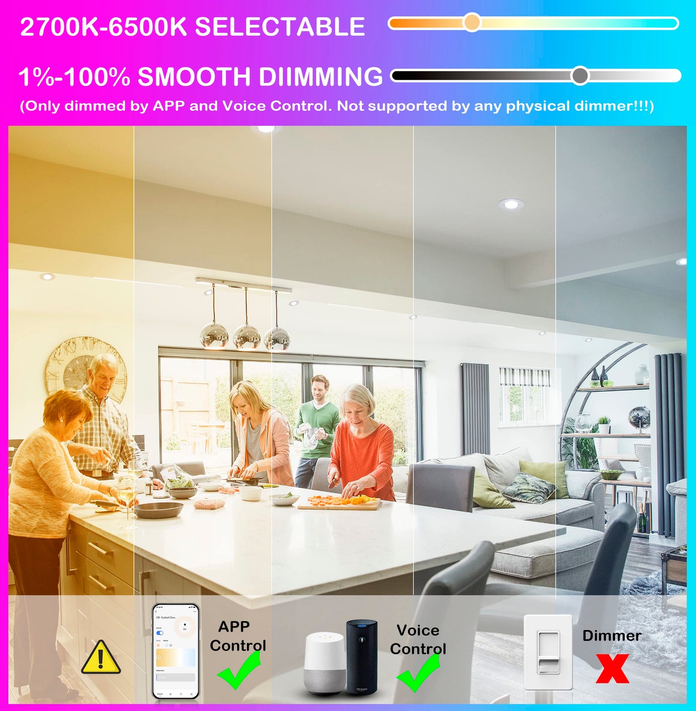 Q: How do I control the lighting options for these recessed lights?A: You can control the lighting options through the CloudyBay app, which allows you to set the color temperature from 2700K to 6500K and choose from over 16 million colors. Additionally, voice commands can be used for adjustments when connected to Alexa or Google Assistant.