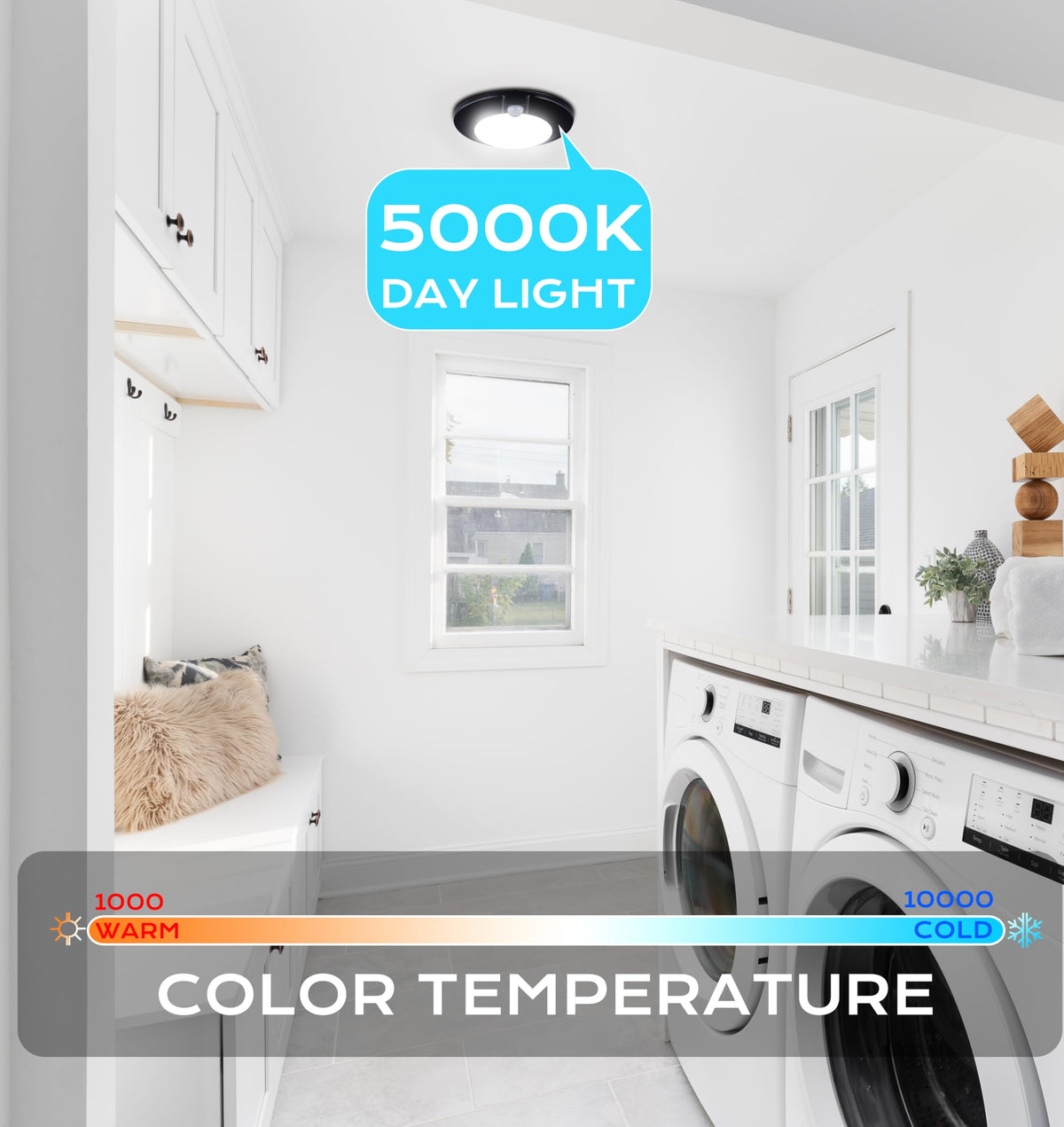 Q: What is the color temperature of the light?A: The CLOUDY BAY Motion Sensor Ceiling Light emits a bright daylight color temperature of five thousand Kelvin.