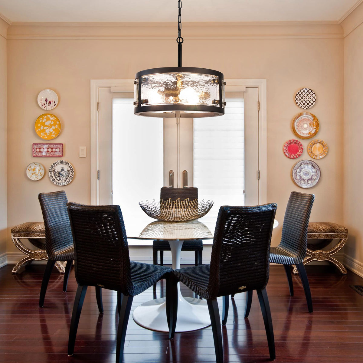 Cnratye 13'' Industrial Drum Glass Chandelier, 3-Light Rustic Hanging Pendant Lights, Metal Round Lighting Fixture For Dining Ro