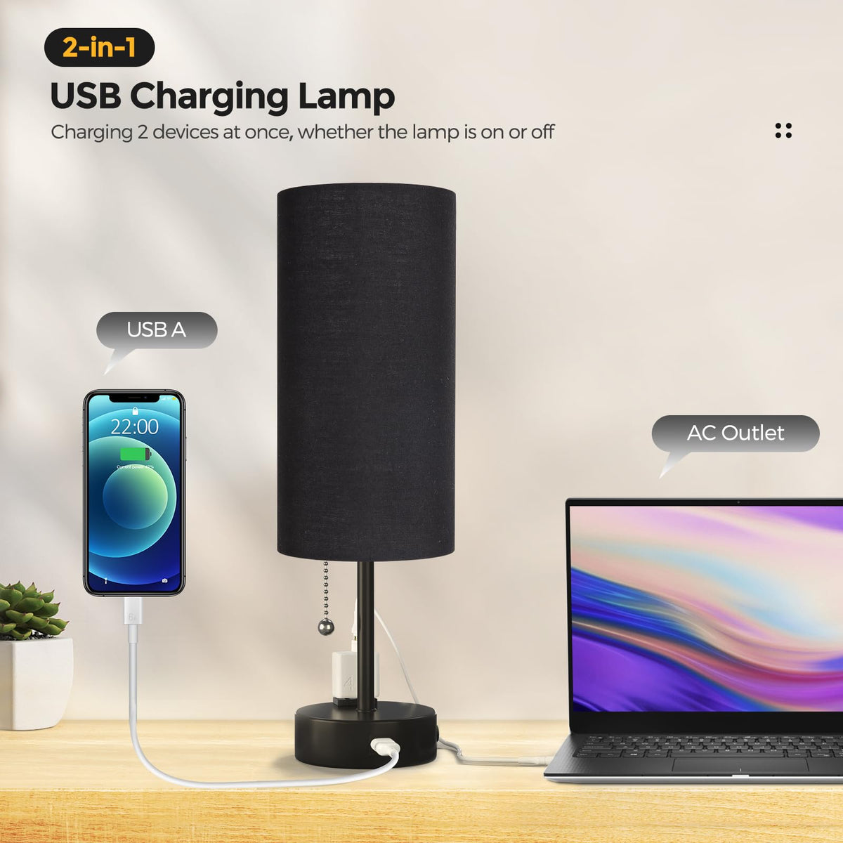 Q: Does the lamp have a USB charging port?A: Yes, this bedside lamp is equipped with a USB A charging port along with an AC outlet, allowing you to charge two devices simultaneously, whether the lamp is on or off.