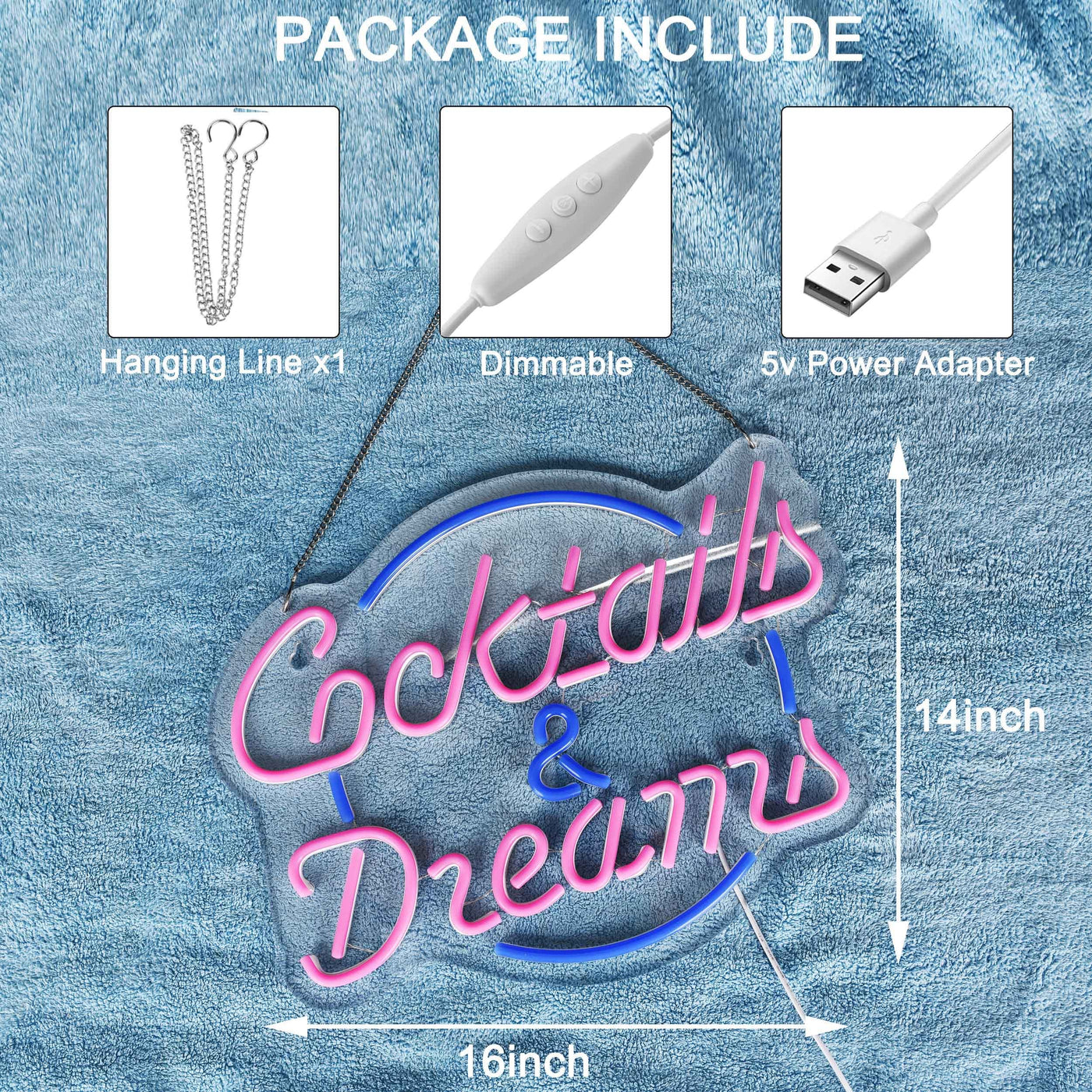 Q: What are the dimensions of the Cocktails and Dreams Neon Sign?A: The Cocktails and Dreams Neon Sign measures 41x36 cm (16x14 inches), making it a perfect size for various wall decor applications.