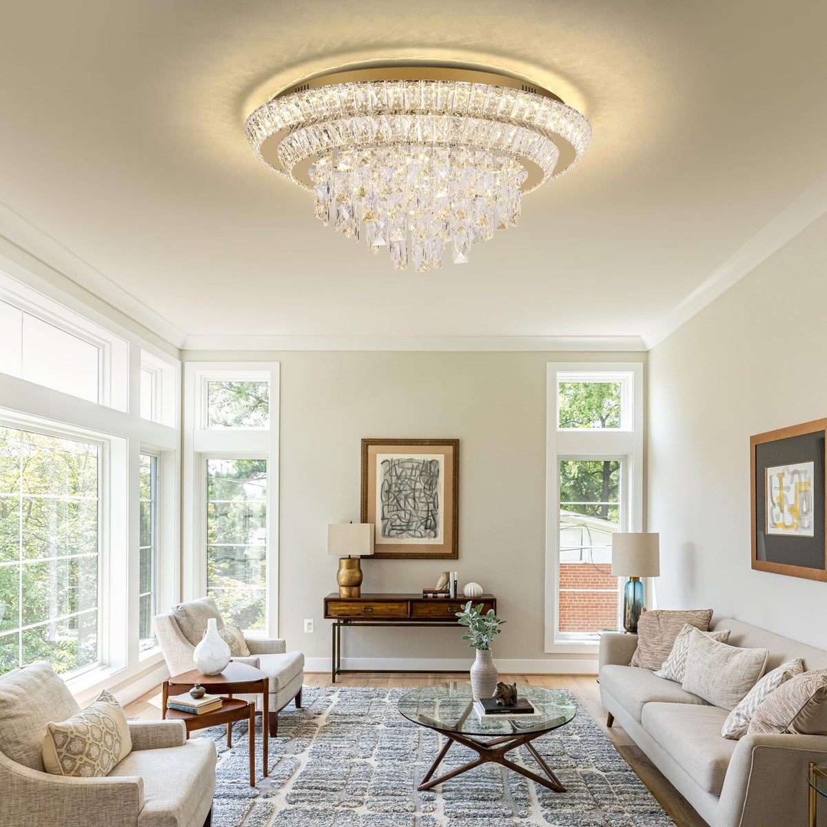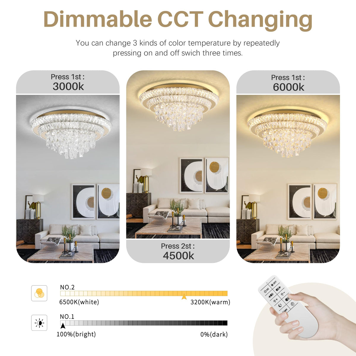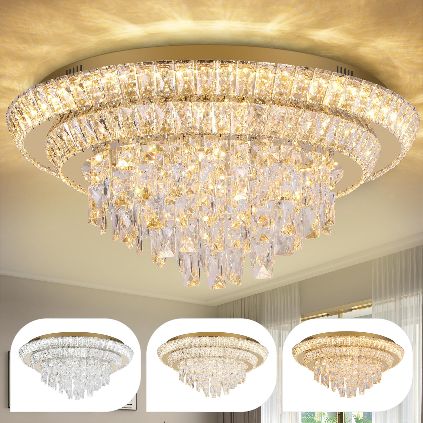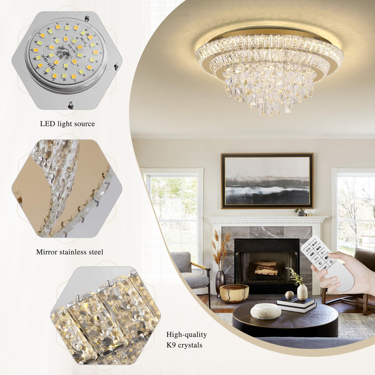 Elegant Crystal Flush Mount Light Fixture - Modern Luxury Meets Functionality Transform your space with our stunning **24'' x 12''H Crystal Flush Mount Light**, designed to elevate any room with its sophisticated two-layer LED light sources. Each layer boasts a powerful 45W output, delivering brilliant illumination while maintaining a sleek, close-to-ceiling profile. The elegant design features a polished 24'' x 1.57''H canopy and a 10'' lamp height, making it a perfect blend of modern aesthetics and timeless charm. Customizable Ambience for Every Mood Create the perfect atmosphere with ease! Our light fixture allows you to effortlessly adjust between three color temperatures-**3000K warm white** for a cozy vibe, **4000K natural white** for balanced brightness, and **6000K cool white** for a crisp, energizing glow. The included remote control takes customization to the next level, letting you fine-tune both color temperature and brightness to match your decor or mood seamlessly. Premium Quality & Energy Efficiency Crafted with **high-quality K9 crystals** and **rust-resistant stainless steel**, this fixture is built to last. The integrated LED chips are not only energy-efficient but also easy to maintain, helping you save on energy bills while enjoying long-lasting, dazzling light. Versatile for Any Space Whether its your hallway, bedroom, kitchen, living room, or balcony, this crystal light fixture adds a touch of modern luxury to any setting. Its versatile design complements a wide range of interior styles, making it a perfect choice for foyers, walk-in closets, dining rooms, and more. Hassle-Free Installation & Reliable Support Weve made installation a breeze! All parts are clearly labeled, and the step-by-step instructions guide you through mounting the top plate and attaching the crystals. If you have any questions, our dedicated customer support team is just a message away, ready to assist you within 24 hours. Upgrade your home lighting with this exquisite crystal flush mount light-where elegance meets practicality, and every detail is designed to impress.