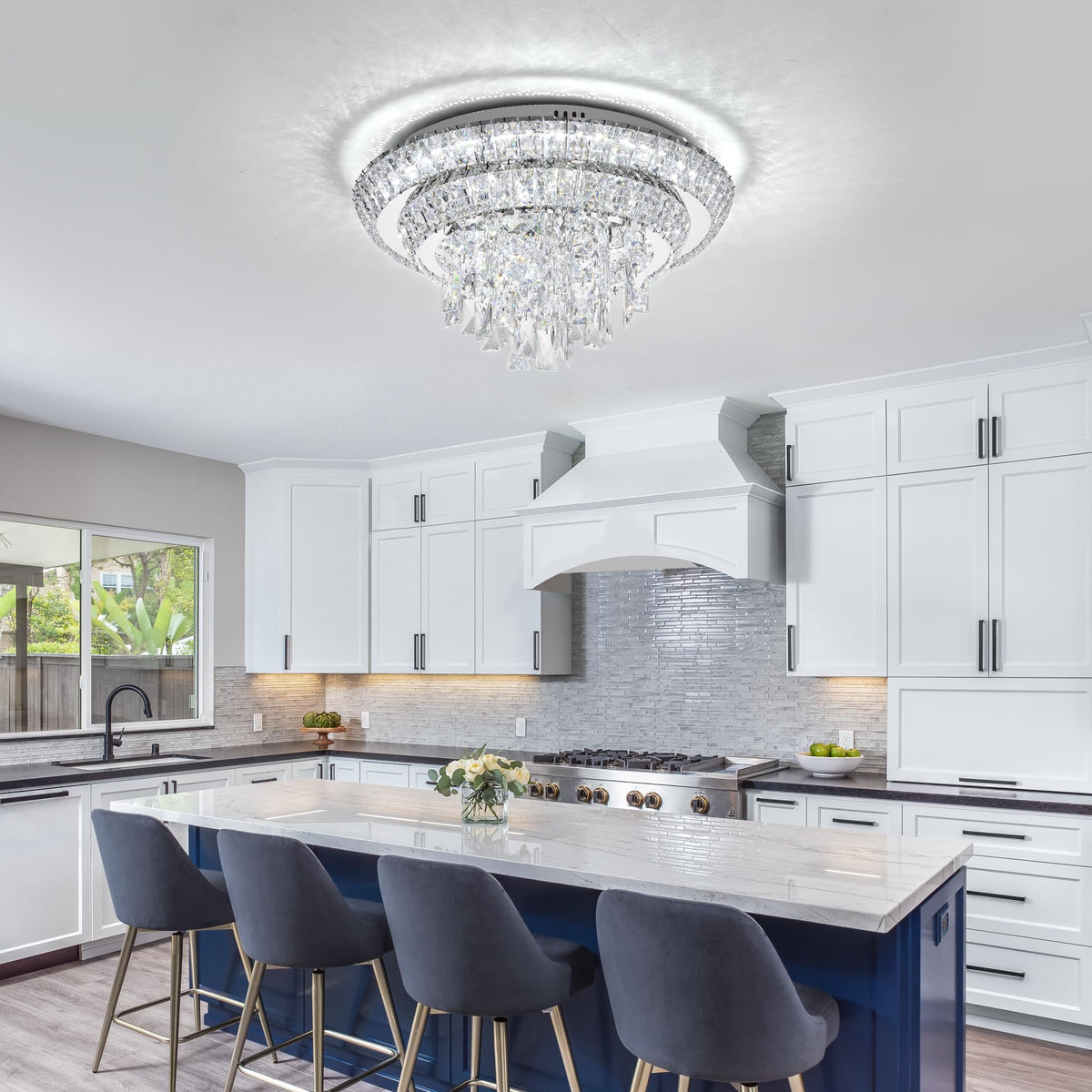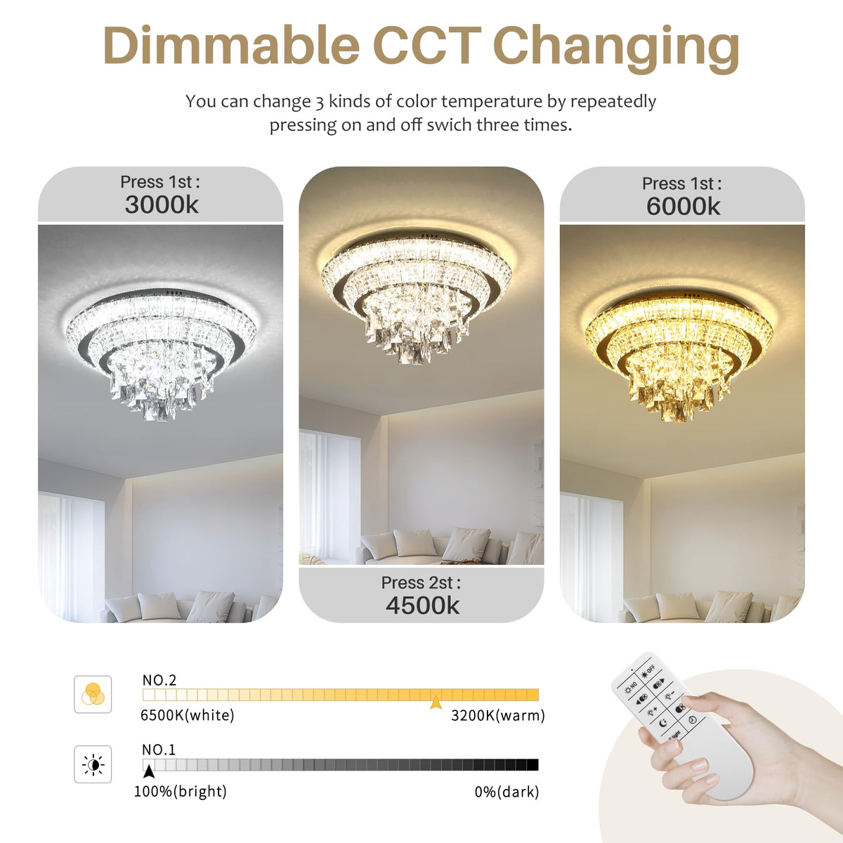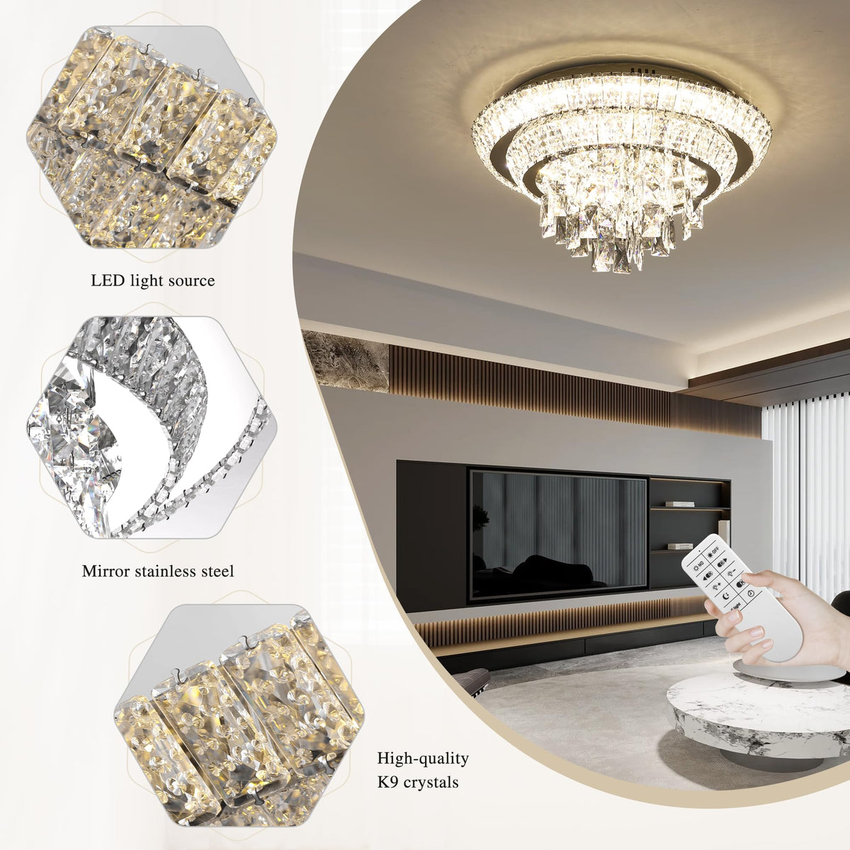 Modern Luxury Meets Functionality: Transform your space with our stunning 18'' x 10''H Crystal Flush Mount Light, designed to elevate any room with its sophisticated two-layer LED light sources. Each layer boasts a powerful 45W output, delivering brilliant illumination while maintaining a sleek, close-to- ceiling profile. The elegant design features a polished 18'' x 1.57''H canopy and a 10'' lamp height, making it a perfect blend of modern aesthetics and timeless charm. Customizable Ambience for Every Mood: Create the perfect atmosphere with ease! Our light fixture allows you to effortlessly adjust between three color temperatures-3000K warm white for a cozy vibe, 4000K natural white for balanced brightness, and 6000K cool white for a crisp, energizing glow. The included remote control takes customization to the next level, letting you fine-tune both color temperature and brightness to match your decor or mood seamlessly. Premium Quality & Energy Efficiency: Crafted with high-quality K9 crystals and rust-resistant stainless steel, this fixture is built to last. The integrated LED chips are not only energy-efficient but also easy to maintain, helping you save on energy bills while enjoying long-lasting, dazzling light. Versatile for Any Space: Whether its your hallway, bedroom, kitchen, living room, or balcony, this crystal light fixture adds a touch of modern luxury to any setting. Its versatile design complements a wide range of interior styles, making it a perfect choice for foyers, walk-in closets, dining rooms, and more. Premium Quality & Energy Efficiency: Crafted with high-quality K9 crystals and rust-resistant stainless steel, this fixture is built to last. The integrated LED chips are not only energy-efficient but also easy to maintain, helping you save on energy bills while enjoying long-lasting, dazzling light.